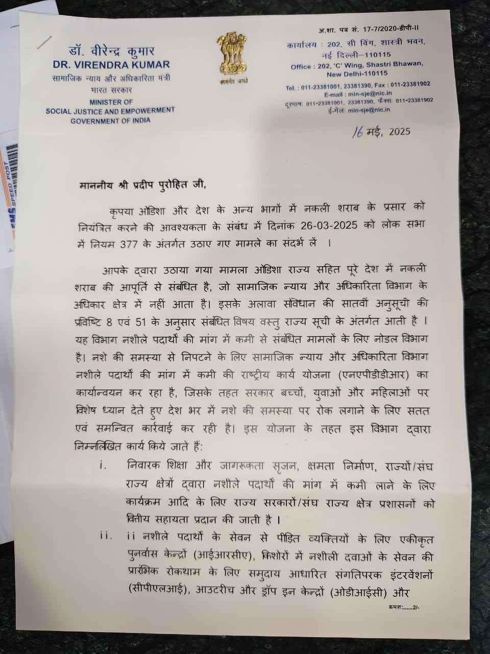 ଗତ ରୁଲ୍-୩୭୭ ଆଧାରରେ ଉଠାଯାଇଥିବା ପ୍ରସଙ୍ଗକୁ ମନ୍ତ୍ରାଳୟ ଗୁରୁତର ସହ ନେଇଛି ବୋଲି କହିଛନ୍ତି କେନ୍ଦ୍ରମନ୍ତ୍ରୀ । ରାଜ୍ୟ ତଥା ଦେଶରେ ନକଲି ମଦ ବନ୍ଦ କରିବା ସମ୍ପର୍କରେ ସାଂସଦ ଯେଉଁ ଉଦବେଗ ପ୍ରକାଶ କରିଛନ୍ତି ତାହା ଭାରତ ସରକାରଙ୍କ ସାମଜିକ ନ୍ୟାୟ ଓ ସଶକ୍ତିକରଣ ମନ୍ତ୍ରାଳୟ ଅଧିନରେ ଆସୁନାହିଁ । ସମ୍ବିଧାନର ସପ୍ତମ ଅନୁଚ୍ଛେଦ ୮ ଏବଂ ୫୧ ଅନୁସାରେ ଏହା ବିଭିନ୍ନ ରାଜ୍ୟ ସରକାରଙ୍କ ନିୟନ୍ତ୍ରଣ ପରିସରଭୁକ୍ତ ବୋଲି ସେ କହିଛନ୍ତି । ଏହି ବିଭାଗ ନିଶାଦ୍ରବ୍ୟର ଆବଶ୍ୟକତା ଓ ବ୍ୟବହାରିତାକୁ ନେଇ ଏକ ନୋଡାଲ ସଂସ୍ଥା ନିୟୋଜିତ ହୋଇଛି । ଯାହାକି ନ୍ୟାସନାଲ ଆକ୍ସନ ପ୍ଲାନ୍ ଫର୍ ଡ୍ରଗ୍ ଡିମାଣ୍ଡ ଆଣ୍ଡ ରିଡକ୍ସନ୍ ଅଧିନରେ କାର୍ଯ୍ୟ କରୁଛି । ଏହାଦ୍ୱାରା ଦେଶର ଶିଶୁ, ଯୁବ, ମହିଳାଙ୍କ ପ୍ରତି ବିଶେଷ ଧ୍ୟାନ ଦେଇ ନିଶା ନିବାରଣରୁ ଦୂରେଇ ରଖିବା ପାଇଁ ଅନେକ କାର୍ଯ୍ୟକ୍ରମ ଗ୍ରହଣ କରାଯାଇଛି । ବିଶେଷକରି ଦେଶରେ ନିଶାଦ୍ରବ୍ୟର ବହୁଳ ବ୍ୟବହାର ରୋକିବାକୁ ବିଭିନ୍ନ ସଚେତନତାମୂଳକ କାର୍ଯ୍ୟକ୍ରମ ଏବଂ ପୀଡ଼ିତାଙ୍କୁ କ୍ଷମତାସମ୍ପନ୍ନ କରିବାକୁ ଏକାଧିକ ଯୋଜନା କାର୍ଯ୍ୟକାରୀ କରାଯାଉଛି । ଯାହାକି ବିଭିନ୍ନ ରାଜ୍ୟ ଓ କେନ୍ଦ୍ରଶାସିତ ଅଂଚଳ ଦ୍ୱାରା ନିୟନ୍ତ୍ରଣ କରାଯାଉଛି । ନିଶାସେବନରେ ଆକ୍ରାନ୍ତଙ୍କ ପୂର୍ନବାସ ପାଇଁ ତଥା ଶିଶୁ ମାନଙ୍କୁ ପ୍ରାରମ୍ଭିକ ନିଶା ସେବନରୁ ଦୂରେଇ ରଖିବା ପାଇଁ ବିଭିନ୍ନ ଥଇଥାନ କେନ୍ଦ୍ର କରାଯାଇଛି । ଏହା କେନ୍ଦ୍ର ସରକାରଙ୍କ ଆଇଆରସିଏ ଓ ସିପିଏଲଆଇ ମାଧ୍ୟମରେ