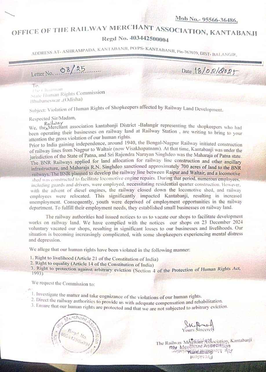 କଣ୍ଟାବାଞ୍ଜି (କୈଳାସ ସଗ୍ରିଆ) ବଲାଙ୍ଗିର ଜିଲ୍ଲା କଣ୍ଟାବାଞ୍ଜି ରେଲୱେ ଷ୍ଟେସନ ରେ ରେଳବାଇ ପକ୍ଷରୁ ରେଳବାଇ ଷ୍ଟେସନ ବିକାଶ ପାଇଁ ଜମି ଆବଶ୍ୟକତା ପଡ଼ିବାରୁ ରେଳବାଇ ଜମି ରେ ୫୦ ବର୍ଷ ରୁ ଦୋକାନ କରିଥିବା ଦୋକାନୀ ମାନଙ୍କୁ ଦୋକାନ ଗୁଡିକ ଉଛେଦ କରିବାକୁ ନୋଟିସ ଦିଆଯାଇଥିବା ବେଳେ ୪୦ ରୁ ୫୦ ଦୋକାନୀ ନିଜ ଦୋକାନ ଗୁଡିକ ରେଳବାଇ ଷ୍ଟେସନ ବିକାଶ କରିବା ପାଇଁ ରେଳବାଇ ପକ୍ଷରୁ ଦେଇଥିବା ନୋଟିସ ପାଳନ କରି ନିଜ ଦୋକାନ ଗୁଡିକ ତା - ୨୩-୧୨--୨୦୨୪ ଉଛେଦ କରିଦେଇଛନ୍ତି ବୋଲି କଣ୍ଟାବାଞ୍ଜି ରେଲୱେ ମାର୍ଚ୍ଚାଣ୍ଟ ଆସୋସିଏସନ ପକ୍ଷରୁ କୁହାଯାଇଥିବା ଜଣାପଡିଛି। ସୂଚନାଯୋଗ୍ୟ ଯେ,କଣ୍ଟାବାଞ୍ଜି ରେଲୱେ ମାର୍ଚ୍ଚାଣ୍ଟ ଆସୋସିଏସନ ସୁଚନା ଅନୁଯାୟୀ ୩୦ ରୁ ୪୦ ଦୋକାନୀ ମାନଙ୍କର ପରିବାରର ଓ ତାଙ୍କର ସନ୍ତାନ ପାଠ ପଢା ଏହି ଦୋକାନ ଗୁଡିକ ବ୍ୟବସାୟ ରୋଜଗାର ଉପରେ ନିର୍ଭରଶୀଳ ରହିଥିବା ଜଣାଯାଏ। ବର୍ତ୍ତମାନ ପ୍ରାୟ ୫ ମାସ ହେବ ଏହି ଦୋକାନୀ ମାନଙ୍କର ଅର୍ଥିକ ଅବସ୍ଥା ଅଭାବ ଶୋଚନୀୟ ହୋଇ ପଡିଛି । ଦୋକାନୀ ମାନେ ଅଭିଯୋଗ କରିଛନ୍ତି ଯେ, ସେମାନଙ୍କର ପରିବାର ଚଳାଇବା ଓ ସ୍କୁଲ ,କଲେଜ ତାଙ୍କର ସନ୍ତାନ ମାନଙ୍କୁ ପାଠ ପଢ଼ାଇବା ପାଇଁ ଅନେକ ସମସ୍ୟା ର ସମୁଖୀନ ହେବା କୁ ପଡ଼ୁଛି। କଣ୍ଟାବାଞ୍ଜି ରେଲୱେ ମାର୍ଚ୍ଚାଣ୍ଟ ଆସୋସିଏସନ ପକ୍ଷରୁ ରେଳବାଇ ଜମି ଉଛେଦ ଦୋକାନୀ ମାନଙ୍କର ଥାଇଥାନ ଓ କ୍ଷତି ପୂରଣ ପ୍ରଦାନ ନେଇ ଭାରତ ସରକାର ରେଳବାଇ ମନ୍ତ୍ରୀ, ବଲାଙ୍ଗୀର ସାଂସଦ ଶ୍ରୀମତି ସଙ୍ଗିତା କୁମାରୀ ସିଂହଦିଓ ବଲାଙ୍ଗୀର ଜିଲ୍ଲାପାଳ, ଜିଏମ, ଭୁବନେଶ୍ୱର,ଡିଆରମ, ସମ୍ବଲପୁର, ପୂର୍ବତନ ବିଧାୟକ ତଥା ଓଡ଼ିଶା କଂଗ୍ରେସ କମିଟି ଉପାଧ୍ୟକ୍ଷ ସନ୍ତାଷ ସିଂ ସାଲୁଜା ଙ୍କୁ ଚିଠି ମାଧ୍ୟମ ରେ ଜଣାଇଥିବା ଜଣାପଡିଛି। ଏହା ବ୍ୟତିତ କଣ୍ଟାବାଞ୍ଜି ରେଲୱେ ମାର୍ଚ୍ଚାଣ୍ଟ ଆସୋସିଏସନ ମାନବ ଅଧିକାର କମିଶନ, ଭୁବନେଶ୍ୱର ଙ୍କୁ ମଧ୍ୟ ଥାଇଥାନ ଓ କ୍ଷତି ପୂରଣ ଆଇନଗତ କାର୍ଯ୍ୟାନୁଷ୍ଠାନ ଗହଣ କରିବା ପାଇଁ ଚିଠି ଲେଖିଛନ୍ତି। ଏନେଇ କ୍ଷତି ପୂରଣ ଓ ଥାଇଥାନ ଯଥା ଶୀଘ୍ର କେନ୍ଦ୍ର ସରକାର ଓ ରାଜ୍ୟ ସରକାର ପ୍ରଦାନ କରିବାକୁ କଣ୍ଟାବାଞ୍ଜି ରେଲୱେ ମାର୍ଚ୍ଚାଣ୍ଟ ଆସୋସିଏସନ ଦାଵୀ କରୁଛନ୍ତି।