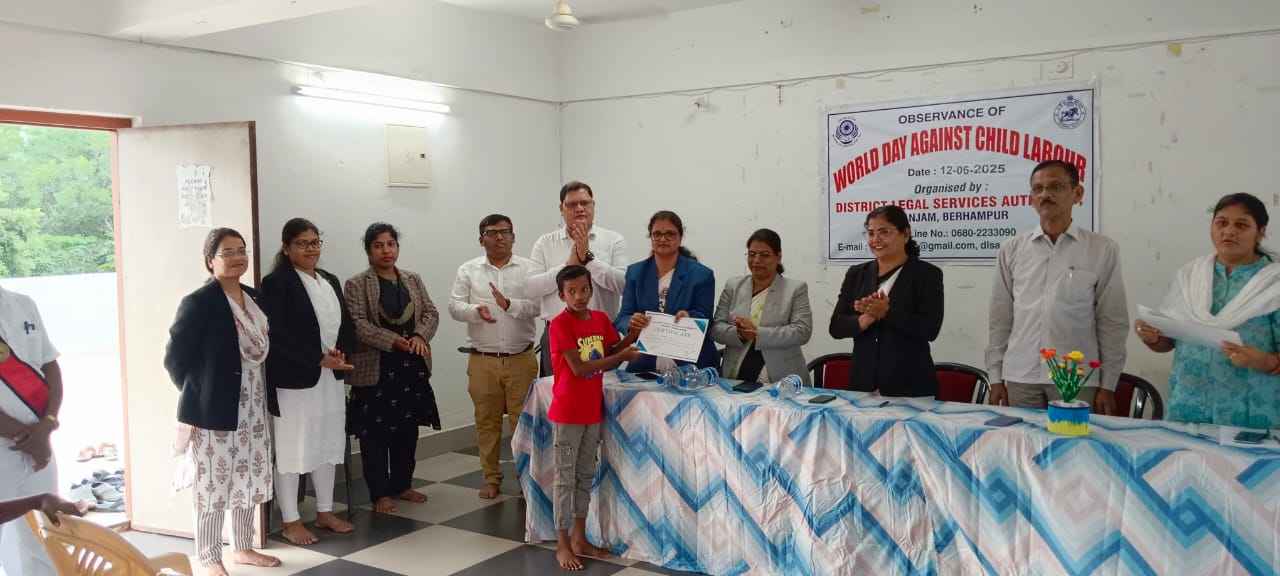ଗଞ୍ଜାମ ଜିଲ୍ଲା ଆଇନସେବା ପ୍ରାଧିକରଣ,ବ୍ରହ୍ମପୁର ଦ୍ୱାରା ଗୁରୁବାର ଶ୍ରଦ୍ଧା ସଂଜୀବନୀ, ଗୋପାଳପୁର ଠାରେ ଜିଲ୍ଲା ଓ ଦୌରା ଜଜ ତଥା ଜିଲ୍ଲା ଆଇନ ସେବା ପ୍ରାଧିକରଣ ଅଧ୍ୟକ୍ଷା ଡ଼ା ଭାଗ୍ୟଲକ୍ଷ୍ମୀ ରଥଙ୍କ ନିର୍ଦ୍ଦେଶକ୍ରମେ ଜିଲ୍ଲା ଆଇନ ସେବା ପ୍ରାଧିକରଣ ସଚିବ ଦେବଶ୍ରୀ ସାହୁଙ୍କ ପରିଚାଳନାରେ ବିଶ୍ୱ ଶିଶୁ ଶ୍ରମିକ ନିରୋଧ ଦିବସ ପାଳନ ଉପଲକ୍ଷେ ଏକ ସଚେତନତା କାର୍ଯ୍ୟକ୍ରମ ଅନୁଷ୍ଠିତ ହୋଇଥିଲା । ଏହି କାର୍ଯ୍ୟକ୍ରମରେ ଶିଶୁ ମାନଙ୍କର ଯତ୍ନ, ଶିଶୁ ଅଧିକାର ସୁରକ୍ଷା ଆଇନ, ଶିଶୁ ଶ୍ରମିକ ନିରାକରଣ ଆଇନ ସୁଚାରୁରୂପେ ପରିଚାଳନା ତଥା ଆଇନ ସେବା ପ୍ରାଧିକରଣର ଅଧିନିୟମ ୧୯୮୭ ରେ ଥିବା ବିଭିନ୍ନ ଵିଧିବ୍ୟବସ୍ଥା ଲକ୍ଷ୍ୟ ଓ ଆଭିମୁଖ୍ୟ,ନିଃଶୁଳ୍କ ଆଇନ ସେବା ପାଇଁ ଯୋଗ୍ୟ ହିତାଧିକାରୀ ବିଷୟରେ ଆଲୋଚନା କରାଯାଇଥିଲା l ଏହି ଅବସରରେ ଶ୍ରଦ୍ଧା ସଂଜୀବନୀର ଛାତ୍ରଛାତ୍ରୀ ମାନଙ୍କୁ ନେଇ ଏକ ଚିତ୍ରାଙ୍କନ ପ୍ରତିଯୋଗୀତା ଆୟୋଜନ କରାଯାଇ ଥିଲା l ବିଜେତା ତଥା ପ୍ରତିଯୋଗୀ ମାନଙ୍କୁ ଜିଲ୍ଲା ଓ ଦୌରା ଜଜ ତଥା ପ୍ରାଧିକରଣ ଅଧ୍ୟକ୍ଷା ଡ଼ା ଭାଗ୍ୟଲକ୍ଷ୍ମୀ ରଥ ଏବଂ ଉପସ୍ଥିତ ପଦାଧିକାରୀଙ୍କ ଦ୍ୱାରା ପୁରସ୍କୃତ କରାଯାଇଥିଲା l ଏହି ଅବସରରେ ପରିବାର ଅଦାଲତ ବିଚାରପତି ଶ୍ରୀମତୀ ଜାନକୀ ବିଶ୍ୱାଳ,ପିଓ ଓପିଆଇଡି ବିଚାରପତି ଶ୍ରୀମତୀ ସଂଗୀତା ପାଣି,ସିନିୟର ସିଭିଲ ଜଜ (LR<V)ଶ୍ରୀ କମଳାକାନ୍ତ ରାଉତ,ସିନିୟର ସିଭିଲ ଜଜ ଶ୍ରୀ ବ୍ୟୋମକେଶ ନାୟକ, ସିଭିଲ ଜଜ ଜୁନିଅର ଡିଭିଜନ ଶ୍ରୀମତୀ ସସ୍ମିତା ସେଠି,ଜେଏମଏସସି ସସ୍ମିତା ସାମଲ ,ଜେଏମଏସସି ଦୀପିକା ବଡ଼ମାଳି, ଶ୍ରଦ୍ଧା ସଂଜୀବନୀ ପରିଚାଳକ ଲୋକନାଥ ମିଶ୍ର,ଜିଲ୍ଲା ଶିଶୁ ସୁରକ୍ଷା ଅଧିକାରୀ ରାଜଶ୍ରୀ ଦାସ,ସିଡବ୍ଲୁସି ସଦସ୍ୟ ଡ଼ଃ ଦିଲ୍ଲୀପ କୁମାର ତ୍ରିପାଠୀ ଏବଂ ଶ୍ରୀ ପ୍ରଣବ ପାଢ଼ୀ,ଜିଲ୍ଲା ଆଇନ ସେବା ପ୍ରାଧିକରଣ ସଦସ୍ୟ ଶ୍ରୀ ଟି.କେ ରେଡ୍ଡୀ,ପିଏଲଏ-ପିୟୁଏସ ସଦସ୍ୟା ଭାରତି ପାତ୍ର, ପ୍ୟାନେଲ ଓକିଲ ଶ୍ରୀ ଟି. ସୁଶାନ୍ତଙ୍କ ସମେତ ପାରାଲିଗଲ ସ୍ବେଛାସେବୀ,ଆଶ୍ରମର ସମସ୍ତ କର୍ମକର୍ତ୍ତା,ଛାତ୍ରଛାତ୍ରୀ ପ୍ରମୁଖ ଉପସ୍ଥିତ ରହିଥିଲେ l