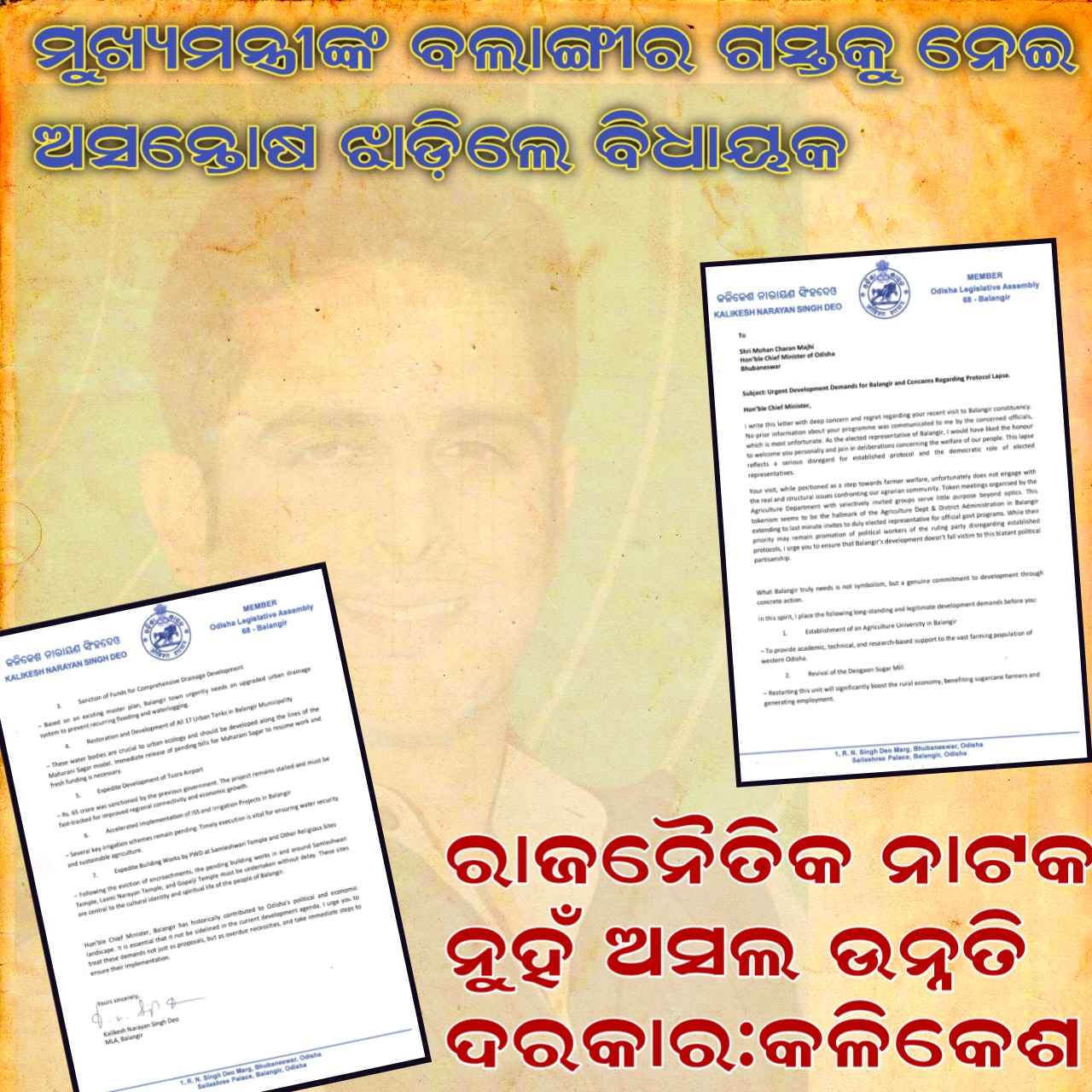 ବଲାଙ୍ଗିର(ପ୍ରେରଣା ଖବର): ବଲାଙ୍ଗିର ବିଧାୟକ ତଥା ବିଜେଡିର ବରିଷ୍ଠ ନେତା କଳିକେଶ ନାରାୟଣ ସିଂହଦେଓ ମୁଖ୍ୟମନ୍ତ୍ରୀ ମୋହନ ଚରଣ ମାଝିଙ୍କ ବଲାଙ୍ଗିର ଗସ୍ତକୁ ନେଇ ତୀବ୍ର ପ୍ରତିକ୍ରିୟା ବ୍ୟକ୍ତ କରିଛନ୍ତି। ସେ ଏକ ଖୋଲା ଚିଠି ମାଧ୍ୟମରେ ମୁଖ୍ୟମନ୍ତ୍ରୀଙ୍କୁ ସୂଚିତ କରିଛନ୍ତି ଯେ, ନିଜ ନିର୍ବାଚିତ ମଣ୍ଡଳୀକୁ ମୁଖ୍ୟମନ୍ତ୍ରୀଙ୍କ ସରକାରି ଗସ୍ତ ହୋଇଥିବା ସତ୍ତ୍ୱେ ତାଙ୍କୁ କୌଣସି ସୂଚନା ଦିଆଯାଇନାହିଁ, ଯାହା ଗଣତନ୍ତ୍ରିକ ସମ୍ବିଧାନିକ ବ୍ଯବସ୍ଥା ଉପରେ ଏକ ଗଭୀର ଅସମ୍ମାନ। ବିଧାୟକ କଳିକେଶ ଲେଖିଛନ୍ତି ଯେ, “ମୁଁ ବଲାଙ୍ଗିରର ନିର୍ବାଚିତ ପ୍ରତିନିଧି ଭାବରେ ମୁଖ୍ୟମନ୍ତ୍ରୀଙ୍କୁ ସ୍ୱାଗତ କରିଥାନ୍ତି ଓ ଆମ ଅଞ୍ଚଳର ଲୋକଙ୍କ ସମସ୍ୟା ଉପରେ ଚର୍ଚ୍ଚା କରିଥାନ୍ତି। କିନ୍ତୁ ମୋତେ ସୂଚିତ କରାଯାଇନଥିବା ଏକ ଗଣତନ୍ତ୍ରିକ ପଦ୍ଧତି ପ୍ରତି ଅସମ୍ମାନ କରାଯାଉଛି l ମୁଖ୍ୟମନ୍ତ୍ରୀଙ୍କ ବଲାଙ୍ଗିର ଗସ୍ତ ସମୟରେ କୃଷି ବିଭାଗ ଦ୍ୱାରା ଆୟୋଜିତ କୃଷକ ସମାବେଶ କୁ ଉପହାସ କରି ବିଧାୟକ କହିଛନ୍ତି ଯେ, ସେଠାରେ କେବଳ ଚୟିତ ବ୍ୟକ୍ତିଙ୍କୁ ଡାକି ଏକ “ନାଟକିୟ ଦୃଶ୍ୟ” ସୃଷ୍ଟି କରା ଯାଉଛି।“ ଏହି ଧରଣର ଏକ ପ୍ରତୀକାତ୍ମକ ରାଜନୈତିକ ଚାଲ ଏବେ ବଲାଙ୍ଗିରରେ ସାଧାରଣ ଘଟଣା ହୋଇଯାଇଛି। ଶାସକ ଦଳର କାର୍ଯ୍ୟକର୍ତ୍ତା ମାନେ ମଞ୍ଚରେ ଥାଆନ୍ତି, କିନ୍ତୁ ଜନତାର ଅସଲ ସମସ୍ୟା ନେଇ କୌଣସି ଅନୁଭବ ନଥାଏ ବୋଲି ବିଧାୟକ ଅଭିଯୋଗ କରିଛିନ୍ତି l