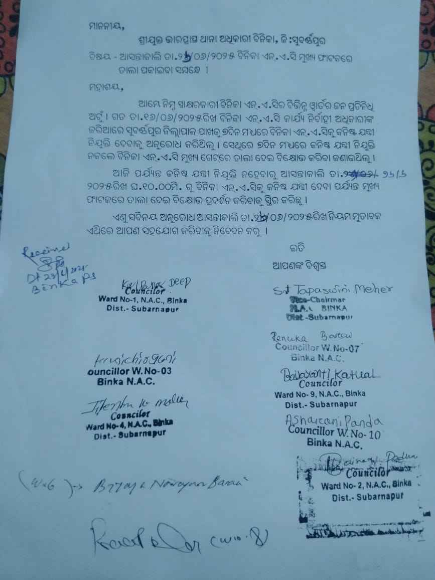ବିନିକା(ହିମାଂଶୁ ଶେଖର ପୁଟେଲ)ବିନିକା ଏନଏଏସିରେ ବର୍ଷେ ରୁ ଅଧିକ ହେଲା କନିଷ୍ଠ ଯନ୍ତ୍ରୀ ନଥିବାରୁ ଉନ୍ନୟନ କାର୍ଯ୍ୟ ସମ୍ପୂର୍ଣ୍ଣ ଠପ।ସେଥିପାଇଁ ଗତ ଚଳିତ ମାସ ୧୬ତାରିଖରେ ଏନଏଏସି ଉପାଧ୍ୟକ୍ଷା ତପସ୍ଵିନୀ ମେହେରଙ୍କ ନେତୃତ୍ୱରେ ଏକ ଦାବିପତ୍ର ସ୍ଥାନୀୟ କାର୍ଯ୍ୟନିର୍ବାହୀ ଅଧିକାରୀଙ୍କ ଜରିଆରେ ସୁବର୍ଣ୍ଣପୁର ଜିଲ୍ଲାପାଳଙ୍କୁ ପ୍ରଦାନ କରାଯାଇ ୭ଦିନ ଭିତରେ କନିଷ୍ଠ ଯନ୍ତ୍ରୀ ନିଯୁକ୍ତି ପାଇଁ ଅନୁରୋଧ କରାଯାଇଥିଲା ।ହେଲେ ୭ଦିନ ପୂରି ଯାଇଛି।ନୂତନ କନିଷ୍ଠ ଯନ୍ତ୍ରୀଙ୍କ ଦେଖାନାହିଁ ।ତେଣୁ ବାଧ୍ୟ ହୋଇ ଯନ୍ତ୍ରୀ ନଆସିବା ଯାଏ କାର୍ଯ୍ୟାଳୟକୁ ତାଲା ପକାଇ ଅନିର୍ଦ୍ଧିଷ୍ଟ କାଳ ପର୍ଯ୍ୟନ୍ତ ବନ୍ଦ ରଖାଯିବ ବୋଲି ଜନପ୍ରତିନିଧି ମାନେ ନିଷ୍ପତି ନେଇଥିବା ଜଣାପଡିଛି ।ମିଳିଥିବା ସୂଚନା ଅନୁସାରେ ୭ଦିନ ବିତିଯିବା ପରେ ସମସ୍ୟାର ସମାଧାନ ନହେବାରୁ ଉପାଧ୍ୟକ୍ଷା ତପସ୍ଵିନୀ ମେହେର, କାଉନସିଲର ଆଶାରାଣୀ ପଣ୍ଡା,ରେଣୁକା ବରାଇ,ବୈଜୟନ୍ତୀ କଟୁଆଳ,କଳ୍ପନା ଦୀପ,କୁନି ଚିରଗୁନି,ବୈରାଗୀ ପ୍ରଧାନ,ଗୋପାଳ କୃଷ୍ଣ ମହାଳିଂ,ବିଜୟ ବରାଇ,ପ୍ରଦୀପ ସେଠୀ,ଜିତେନ୍ଦ୍ର ମଲ୍ଲିକ ପ୍ରମୁଖ ୱାର୍ଡ ପ୍ରତିନିଧି ମାନେ ପୁନର୍ବାର ଏକ ଦାବିପତ୍ର ପ୍ରଦାନ କରି ୨୬ତାରିଖରୁ କାର୍ଯ୍ୟାଳୟ ସମ୍ଭୂଖ ମୁଖ୍ୟ ଫାଟକ ତାଲା ପକାଇ ଧାରଣା ଦେବେ ବୋଲି ପ୍ରଶାସନକୁ ଜଣାଇଛନ୍ତି। ସେମାନେ କହିଛନ୍ତି ଯେ କନିଷ୍ଠ ଯନ୍ତ୍ରୀ ନଥିବାରୁ ଦୀର୍ଘ ବର୍ଷ ହେଲା ବିନିକା ବିଜ୍ଞାପିତ ଅଞ୍ଚଳ ପରିଷଦ ଅଧିନସ୍ତ ବିଭିନ୍ନ ୱାର୍ଡରେ ଉନ୍ନୟନ କାର୍ଯ୍ୟ ସମ୍ପୂର୍ଣ୍ଣ ବନ୍ଦ ରହିଛି।ଏପରିକି କେତେକ କାର୍ଯ୍ୟର ଟେଣ୍ଡର ଓପନ ହୋଇଥିଲେ ମଧ୍ୟ ତାହା ବି ହୋଇପାରୁନାହିଁ ।ଯାହା ଫଳରେ ଜନସାଧାରଣଙ୍କ ଠାରୁ ଲୋକହସା ହେବାକୁ ପଡୁଛି ।ତେଣୁ କନିଷ୍ଠ ଯନ୍ତ୍ରୀ ପଦବୀ ତୁରନ୍ତ ପୂରଣ ନହେବା ପର୍ଯ୍ୟନ୍ତ ପରିଷଦ ବାସୀଙ୍କ ସାମୁହିକ ସ୍ବାର୍ଥ ସକାଶେ ୨୬ତାରିଖରୁ ତାଲା ପକାଇ ଅନିର୍ଦ୍ଧିଷ୍ଟ କାଳ ପର୍ଯ୍ୟନ୍ତ ବିକ୍ଷୋଭ ପ୍ରଦର୍ଶନ ଜାରି ରହିବ ବୋଲି ଚେତାବନୀ ଦେଇଛନ୍ତି।ଯଦି କୌଣସି ଅପ୍ରୀତିକର ପରିସ୍ଥିତି ସୃଷ୍ଟି ହୁଏ ତେବେ ପ୍ରଶାସନ ସମ୍ପୂର୍ଣ୍ଣ ଦାୟୀ ରହିବେ ବୋଲି ସେମାନେ କହିଛନ୍ତି।