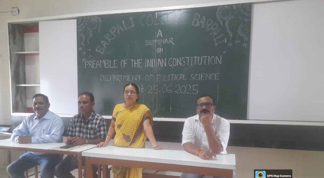 ବରପାଲି ମହାବିଦ୍ୟାଳୟରେ ଅଧ୍ୟକ୍ଷା ଜୟନୀ ଦାଶଙ୍କ ଅଧ୍ୟକ୍ଷତାରେ ସମ୍ବିଧାନ ହତ୍ୟା ଦିବସ ପାଳିତ ହୋଇଯାଇଛି ।ଏହି ସଭାରେ ଇଂରାଜୀ ବିଭାଗ ମୁଖ୍ୟ ପ୍ରଫେସର ସୁଶିଲ କୁମାର ଶତପଥୀ ଓ ଅଧ୍ୟାପକ ଅଶୋକ ପ୍ରଧାନ ଅତିଥି ଭାବରେ ଯୋଗଦେଇ ସମ୍ବିଧାନର ମହତ୍ତ୍ଵ ଉପରେ ବକ୍ତବ୍ୟ ରଖିଥିଲେ। ଏହି ଅବସରରେ ରାଜନୀତି ବିଜ୍ଞାନ ବିଭାଗ ପକ୍ଷରୁ ଭାରତୀୟ ସମ୍ବିଧାନର ପ୍ରସ୍ତାବନା ଶୀର୍ଷକ ଆଲୋଚନାଚକ୍ର ଅନୁଷ୍ଠିତ ହୋଇଥିଲା। ସମଗ୍ର କାର୍ଯକ୍ରମକୁ ଅଧ୍ୟାପକ ଅଲେଖ ମହାନନ୍ଦ ସଂଯୋଜନା କରିଥିବା ବେଳେ ବହୁ ଛାତ୍ର ଛାତ୍ରୀ ସ୍ବରଚିତ ପ୍ରବନ୍ଧ ଉପସ୍ଥାପନା କରିଥିଲେ । ଏହି କାର୍ଯ୍ୟକ୍ରମରେ ମହାବିଦ୍ୟାଳୟର ସମସ୍ତ ଅଧ୍ୟାପକ ଅଧ୍ୟାପିକା ଓ ଛାତ୍ରଛାତ୍ରୀ ଉପସ୍ଥିତ ଥିଲେ।