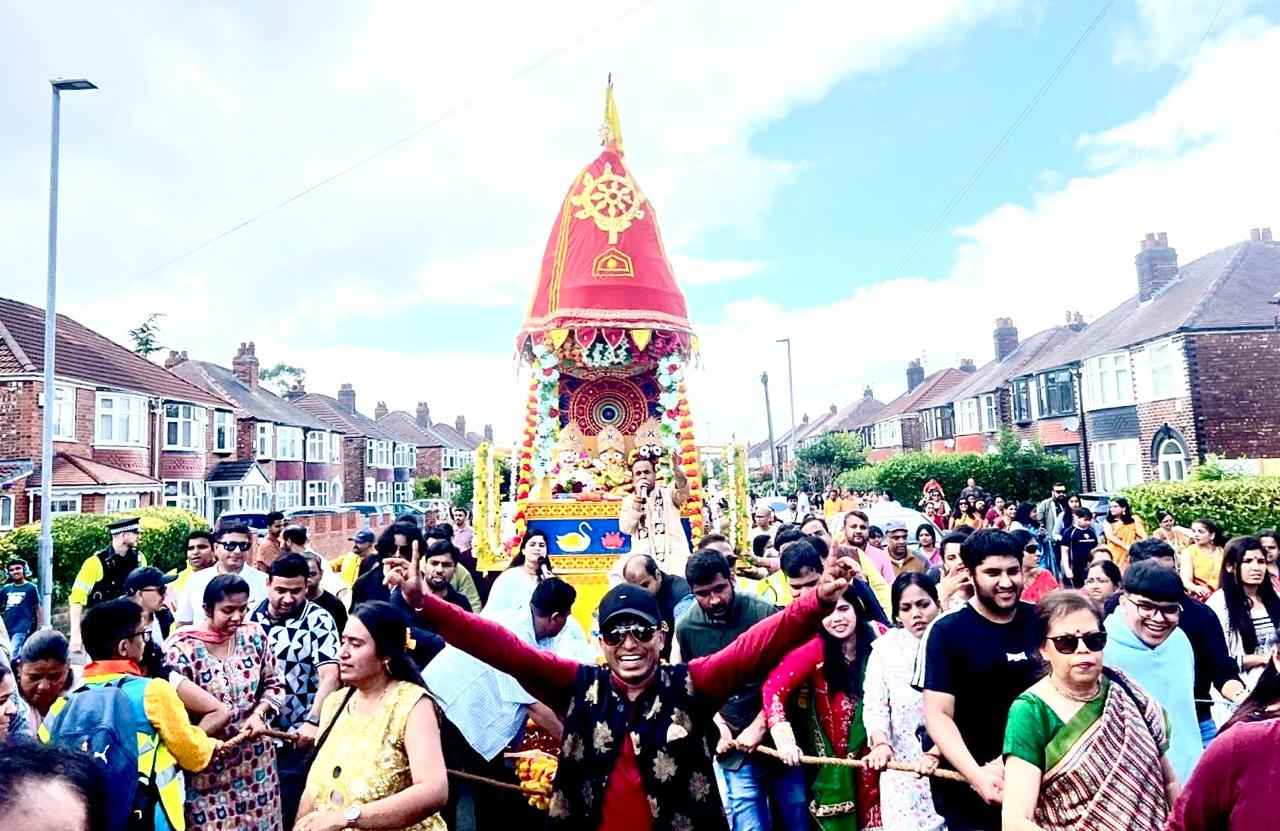 ବିଧି ମୁତାବକ ସମ୍ପନ୍ନ କରାଯାଇଥିଲା। ନର୍ଥୱେଷ୍ଟ ଓଡ଼ିଶା ସୋସାଇଟି ଦ୍ୱାରା ଆୟୋଜିତ ଚଳିତବର୍ଷର ଘୋଷଯାତ୍ରାରେ ସହସ୍ରାଧିକ ଓଡ଼ିଆ ଓ ଅଣଓଡ଼ିଆ ଭକ୍ତଗଣଙ୍କର ସମାଗମ ହୋଇଥିବା ଲକ୍ଷ୍ୟ କରାଯାଇଥିଲା। ଉପସ୍ଥିତ ଶ୍ରଦ୍ଧାଳୁମାନଙ୍କ ମଧ୍ୟରେ ରଥଟଣା ଓ ରଥ ଉପରେ କାଳିଆ ଠାକୁରଙ୍କର ଦର୍ଶନକୁ ନେଇ ପ୍ରବଳ ଆନନ୍ଦ, ଅଜସ୍ର ଉତ୍ସାହ, ଅସୀମ ଉଲ୍ଲାସ ଓ ଅଦମ୍ୟ ଉଦ୍ଦୀପନା ପରିଲକ୍ଷିତ କରାଯାଇଥିଲା। ଦିନ ୧୨ଟା ୪୫ ମିନିଟରେ ଚତୁର୍ଦ୍ଧା ମୂର୍ତ୍ତିଙ୍କୁ ଧାଡ଼ି ପହଣ୍ଡି କରାଯାଇ ଗୀତା ଭବନ ସାମ୍ନାରେ ଦଣ୍ଡାୟମାନ ସୁନ୍ଦର, ସୁଶୋଭିତ ଏବଂ ବିଭିନ୍ନ ରଙ୍ଗବେରଙ୍ଗ କପଡାରେ ସୁସଜ୍ଜିତ ୧୮ ଫୁଟ ଉଚ୍ଚତା ବିଶିଷ୍ଟ ରଥ ଉପରକୁ ନିଆଯାଇଥିଲା। ହରିବୋଲ, ହୁଳହୁଳି ଏବଂ ଜୟ ଜଗନ୍ନାଥ ଧ୍ୱନି ସହ ଭଜନ କୀର୍ତ୍ତନର ମୃଦୁମନ୍ଦ ନାଦରେ ସମଗ୍ର ଗଗନ ପବନ ପ୍ରକମ୍ପିତ ହୋଇ ଉଠିଥିଲା। ବିଶେଷକରି ଏଠାରେ ମହିଳାମାନେ ରୋଷଣୀକରି ମା ସୁଭଦ୍ରାଙ୍କର ପହଣ୍ଡି ବିଜେ କରାଉଥିବାର ଅନୁପମ ଦୃଶ୍ୟ ବେଶ ମର୍ମସ୍ପର୍ଶୀ ଥିଲା। ରଥ ଉପରେ ଶୋଭା ପାଉଥିବା ବିରାଟକାୟ ମନୋରମ ପଟ୍ଟଚିତ୍ରଟିକୁ ପ୍ରଖ୍ୟାତ କଳାକାର ପ୍ରଜ୍ଞା ବାବୁ ଅଙ୍କନ କରିଥିବା ଜଣାଯାଇଛି। ଅପରାହ୍ନ ୧ଟା ୧୫ମିନିଟରେ ରଥଟଣା ପ୍ରକ୍ରିୟା ଆରମ୍ଭ କରାଯାଇଥିଲା। ମାଞ୍ଚେଷ୍ଟରର ରାଜରାସ୍ତାରେ ଗଡ଼ି ଚାଲିଥିବା ରାଜକୀୟ ରଥ ଉପରେ ବଡ଼ ଠାକୁରଙ୍କ ଦର୍ଶନ କରି ଉଭୟ ଦେଶୀ ଓ ବିଦେଶୀ ଭକ୍ତମାନେ କୃତ କୃତ୍ୟ ହେଉଥିବା ଦେଖାଯାଇଥିଲା। ଚଳନ୍ତି ରଥରେ କିଛି ଯାନ୍ତ୍ରିକ ତୃଟି ଯୋଗୁଁ ଏହା ଅଟକିବାକୁ ଯାଉଥିବା ସମୟରେ କୁଶଳୀ କାରିଗର ସିମରନଜିତ ସିଂହ, ତାଙ୍କର କାରିଗରୀ କରିସ୍ମା ପ୍ରଦର୍ଶନ କରି ନିମିଷକ ମଧ୍ୟରେ ରଥକୁ ସଜାଡ଼ି ଦେବାର ଅନୁଭୂତି ଅଲୌକିକ ଥିଲା। ରଥଟିକୁ ୱିଲବ୍ରହମ୍ ରୋଡ, ସେଣ୍ଟ ୱେରବ୍ରୋ ରୋଡ , ବ୍ରାଣ୍ଟିଂଗହୋମ ରୋଡ ଓ ୱିଦିଂଟଙ୍ଗ ରୋଡ ଆଦି ବାଟ ଦେଇ ନଗର ପରିକ୍ରମା କରାଯାଇ ପୁଣି ଗୀତା ଭବନର ବେଢ଼ାକୁ ଫେରାଇ ଅଣାଯାଇଥିଲା।