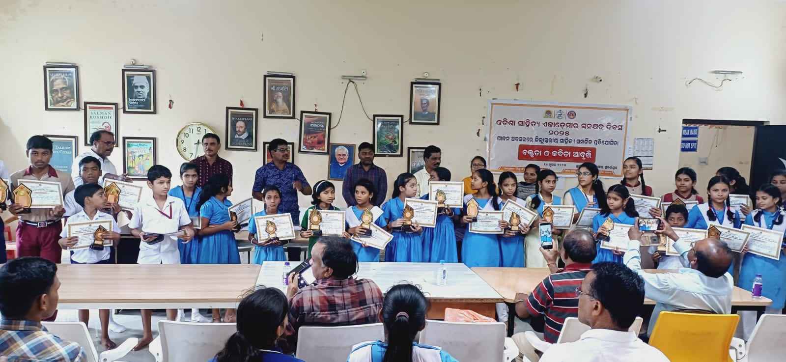 ଓଡିଶା ସାହିତ୍ୟ ଏକାଡେମୀ, ଭୁବନେଶ୍ଵର ର ସ୍ଵନକ୍ଷତ୍ର ଦିବସ ପାଳନ ଅବସରରେ ସୁବର୍ଣ୍ଣପୁର ଜିଲ୍ଲା ସ୍ତରରେ ଷଷ୍ଠ ରୁ ଦଶମ ଶ୍ରେଣୀର ଛାତ୍ର ଛାତ୍ରୀ ମାନଙ୍କ କନିଷ୍ଠ ଓ ବରିଷ୍ଠ ରେ ସାହିତ୍ୟ ସମ୍ପର୍କୀତ ସାଧାରଣ ଜ୍ଞାନ ସହିତ ଇଂରାଜୀ ରୁ ଓଡ଼ିଆ ଅନୁବାଦ, ପ୍ରବନ୍ଧ, କବିତା ଆବୃତ୍ତି ଓ ବକ୍ତୃତା ଜିଲ୍ଲା ସଂସ୍କୃତି ଭବନ ଓ ଜିଲ୍ଲା ପାଠାଗାର, ସୋନପୁର ଠାରେ ଅଦ୍ୟ ତା ୧୦.୦୭.୨୦୨୫ ପୂର୍ବାହ୍ନ ୯.୦୦ ଘଟିକରୁ ଆରମ୍ଭ ହୋଇଥିଲା। ଏହି ପ୍ରତିଯୋଗୀତାରେ ଅତିରିକ୍ତ ଜିଲ୍ଲାପାଳ,(ରାଜସ୍ବ), ସୁବର୍ଣ୍ଣପୁର, ଶ୍ରୀ ରାଜେନ୍ଦ୍ର ମାଝୀ, ମୁଖ୍ୟ ଅତିଥି, ଅତିରିକ୍ତ ଜିଲ୍ଲାପାଳ,( ସାଧାରଣ), ସୁବର୍ଣ୍ଣପୁର,ଶ୍ରୀମତି ଅଞ୍ଜଳିନା ପ୍ରଧାନ, ସମ୍ମାନିତ ଅତିଥି, ଶ୍ରୀ ସମୀର କୁମାର ନାଏକ, ଡେପୁଟି କାର୍ଯ୍ୟ ନିର୍ବାହୀ ଅଧିକାରୀ, (ଓ. ଆର. ଏମ. ଏ .ଏସ) ORMAS, ସୁବର୍ଣ୍ଣପୁର ଓ ସୁଶ୍ରୀ ଯମୁନା ପ୍ରଧାନ, ଜିଲ୍ଲା ସଂସ୍କୃତି ଅଧିକାରୀ, ସୁବର୍ଣ୍ଣପୁର,ଅନ୍ୟତମ ସମ୍ମାନିତ ଅତିଥି ଭାବେ ଯୋଗଦାନ କରିଥିଲେ । ୧୨ (ବାର) ଜଣ ବିଭିନ୍ନ ବର୍ଗର ବିଚରକମାନେ ଉପସ୍ଥିତ ରହି ପ୍ରତ୍ୟେକ ବର୍ଗର ପ୍ରଥମ, ଦ୍ଵିତୀୟ ଓ ତୃତୀୟ ସ୍ଥାନ ଅଧିକାର କରିଥିବା ଛାତ୍ରଛାତ୍ରୀ ମାନଙ୍କୁ ଚୟନ କରିଥିଲେ । ପ୍ରତ୍ୟେକ ବର୍ଗର ପ୍ରଥମ, ଦ୍ଵିତୀୟ ଓ ତୃତୀୟ ସ୍ଥାନ ଅଧିକାର କରିଥିବା ଛାତ୍ରଛାତ୍ରୀ ମାନଙ୍କୁ ମୁଖ୍ୟ ଅତିଥି ଓ ଅନ୍ୟ ସମ୍ମାନିତ ଅତିଥି ମାନଙ୍କ ଦ୍ଵାରା ମାନପତ୍ର ସହିତ ଟ୍ରଫି ପ୍ରଦାନ କରାଯାଇଥିଲା ।ଏହି ପ୍ରତିଯୋଗିତାର ପ୍ରତ୍ୟେକ ବର୍ଗର ପ୍ରଥମ ସ୍ଥାନ ଅଧିକାର କରିଥିବା କନିଷ୍ଠ ଓ ବରିଷ୍ଠ କୃତି ପ୍ରତିଯୋଗୀ ମାନେ ଭୁବନେଶ୍ଵର ସ୍ଥିତ ଉତ୍କଳ ସଙ୍ଗୀତ ମହାବିଦ୍ୟାଳୟ ଠାରେ ଯଥାକ୍ରମେ ଆଗାମୀ ନର୍ବାଚନରେ ତା୧୩.୦୭.୨୦୨୫ ଓ ୨୦.୦୭.୨୦୨୫ ରିଖ ଦିନ ହେବାକୁ ଥିବା ରାଜ୍ୟ ସ୍ତରୀୟ ପ୍ରତିଯୋଗୀତାରେ ଅଂଶଗ୍ରହଣ କରିବେ ।