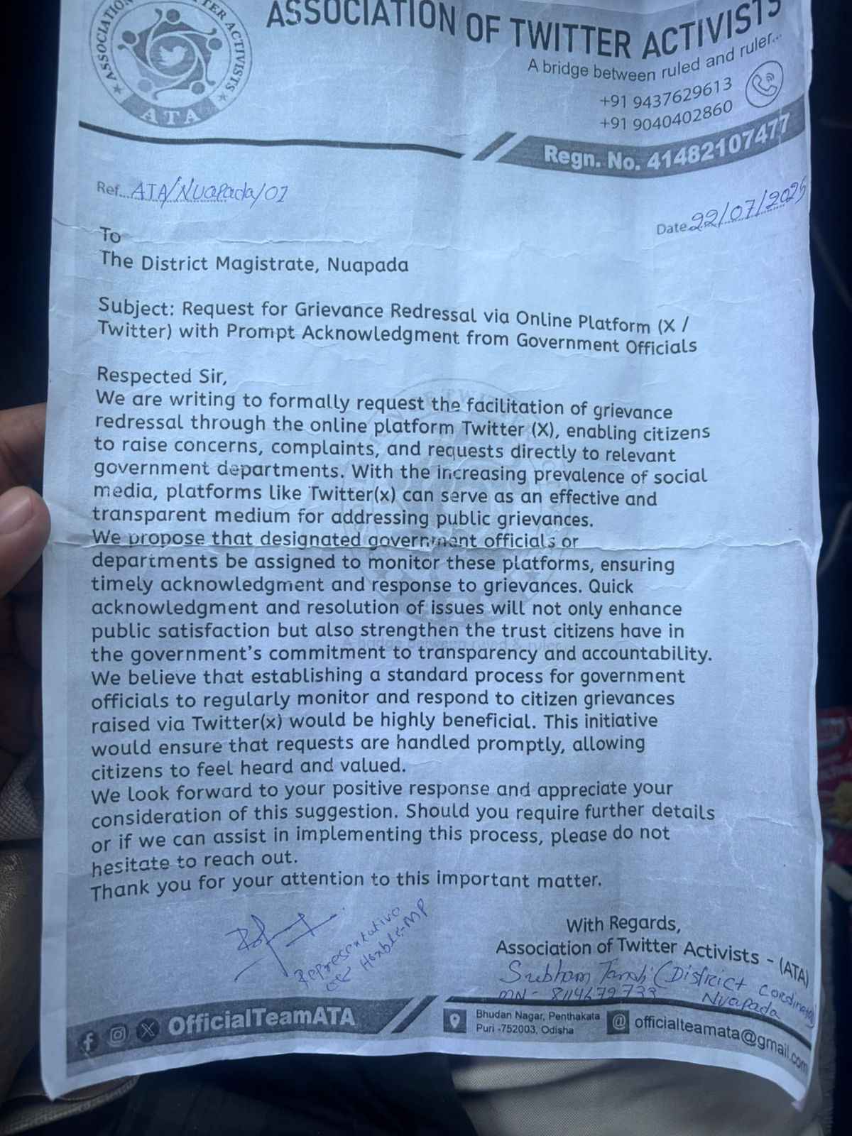 ସେମାନେ ଜଣାଇଛନ୍ତି ଯେ, ସାମାଜିକ ଗଣମାଧ୍ୟମର ବ୍ୟାପକ ପ୍ରଚାର ଓ ପ୍ରଭାବ ମଧ୍ୟନଜରରେ ରଖି, ଟ୍ୱିଟର ମାଧ୍ୟମରେ ଅଭିଯୋଗ ଦାଖଲ କରିବା ପାଇଁ ଏକ ସଂଖ୍ୟାବଦ୍ଧ ପ୍ରକ୍ରିୟା ଗଠନ କରାଯିବା ଅତ୍ୟନ୍ତ ଆବଶ୍ୟକ। ଏହା ମାଧ୍ୟମରେ ଜନସାଧାରଣ ସହଜରେ ନିଜ ଅଭିଯୋଗ, ଅନୁରୋଧ ବା ସୂଚନା ସରକାରୀ ଅଧିକାରୀଙ୍କୁ ଦେଇପାରିବେ।