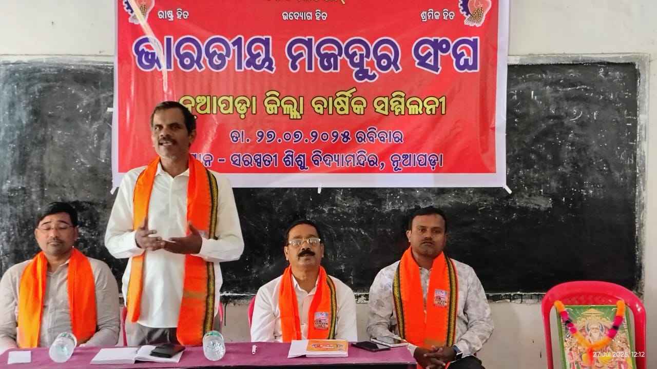 ନୂଆପଡ଼ା - ଆଜି ନୂଆପଡ଼ା ଜିଲ୍ଲା ସଦର ମହକୁମାର ଶିଶୁ ବିଦ୍ୟା ମନ୍ଦିର ଠାରେ ବି ଏମ ଏସ ନୂଆପଡ଼ା ଜିଲ୍ଲା ସଭାପତି ପ୍ରଦୀପ କୁମାର ଦଣ୍ଡସେନାଙ୍କ ଅଧ୍ୟକ୍ଷତାରେ ଆୟୋଜିତ ଜିଲ୍ଲା ସମ୍ମିଳନୀରେ ମୁଖ୍ୟ ଅତିଥି ରୂପେ ଭାରତୀୟ ମଜଦୂର ସଂଘ ରାଜ୍ୟ ସାଙ୍ଗଠନିକ ସମ୍ପାଦକ ଲକ୍ଷ୍ମଣ ଦାସ,ଜିଲ୍ଲା ପ୍ରଭାରୀ ତଥା ରାଜ୍ୟ ସମ୍ପାଦକ ବିଶ୍ଵ ରଞ୍ଜନ ସା,ଜିଲ୍ଲା ସମ୍ପାଦକ ବାବୁଲାଲ ମାଝୀ ଯୋଗଦାନ କରି ମଞ୍ଚାସିନ ଥିଲେ ।ସଭାପତି ବାର୍ଷିକ ସମ୍ମିଳନୀର ଉଦ୍ଦେଶ୍ୟ ଜ୍ଞାପନ କରିଥିବାବେଳେ ସମ୍ପାଦକ ବି ଏମ ଏସ ରେ ଅନୁବନ୍ଧିତ ସମସ୍ତ ସଂଗଠନ ଗୁଡ଼ିକର ସବିଶେଷ ବିବରଣୀ ଉପସ୍ଥାପନ କରିଥିଲେ ।ଆଜିର ମୁଖ୍ୟ ଅତିଥି ଭାରତୀୟ ମଜଦୂର ସଂଘର ବୈଶିଷ୍ଟ୍ୟତା କୁ ପୁଙ୍ଖାନୁପୁଙ୍ଖ ଆଲୋଚନା କରି ସଂଘ କାର୍ଯ୍ୟ କର୍ମକର୍ତ୍ତାଙ୍କ ମନୋବଳ ଦୃଢ଼ କରିବା ସହିତ ଅନ୍ୟ ସମସ୍ତ ସଂଘ ଗୁଡ଼ିକର ଉଦାହରଣ ରଖି ବି ଏମ ଏସ ର ସ୍ୱତନ୍ତ୍ରତା ପ୍ରତିପାଦନ କରିଥିଲେ ।ସଙ୍ଘୀୟ ନୀତି ନିୟମରେ ବାନ୍ଧି ହୋଇ ସର୍ବଦା ଲୋକଙ୍କ ସେବା କରିବାକୁ ଆହ୍ବାନ କରିଛନ୍ତି ।ପ୍ରଭାରୀ ବିଶ୍ଵ ଭାଇ ସମ୍ମିଳନୀ କଣ ଏବଂ ପ୍ରତି ବର୍ଷ ସମ୍ମିଳନୀ କରିବାର ଯଥାର୍ଥତା ସ୍ପଷ୍ଟ ଭାବରେ ବୁଝାଇଥିଲେ ଏବଂ କମିଟି ଗଠନ ଦିଗରେ ଆଲୋଚନା କରିବା ପରେ ସର୍ବ ସମ୍ମତିକ୍ରମେ ପୁନର୍ବାର ଜିଲ୍ଲା ସଭାପତି ପଦରେ ପ୍ରଦୀପ କୁମାର ଦଣ୍ଡସେନାଙ୍କୁ ଏବଂ ଜିଲ୍ଲା ସମ୍ପାଦକ ପଦବୀ ରେ ବାବୁଲାଲ ମାଝୀ ଚୟନିତ ହୋଇଛନ୍ତି ।ଆଜିର ନୂତନ କମିଟି ଗଠନ ହୋଇଛି ଏବଂ ଏହି କମିଟିରେ କୁଞ୍ଜ ବିହାରି କଟା ୱର୍କିଙ୍ଗ ପ୍ରେସିଡେଣ୍ଟ,ଗୋମତୀ ମାଝୀ ଉପ ସଭାନେତ୍ରୀ, ବଳଧର କେତକୀ ସହ ସମ୍ପାଦକ, ଡୋଲେଶ୍ୱରି କଟା ସହ ସଂପାଦିକା,ଦିନ ମଞ୍ଜୁରୀ ଭୋଇ କୋଷାଧ୍ୟକ୍ଷ,ରାମନାଥ ପଣ୍ଡା ମିଡିଆ ସେଲ, ରାଜ କୁମାର ରାଉତ ପର୍ଯ୍ୟାବରଣ ମଞ୍ଚ,ସୁକ ଦେବ ସାହୁ ସାମାଜିକ ସମରସତା,ବିନୟ ରାଉତ କୁଟୁମ୍ବ ପ୍ରବୋଧନ ଏବଂ ପିଣ୍ଟୁ ହଂସଙ୍କୁ ନାଗରିକ କର୍ତ୍ତବ୍ୟ ଦାୟୀତ୍ୱ ପ୍ରଦାନ କରାଯାଇଛି ।ସମ୍ମିଳନୀରେ ଭକ୍ତ ବନ୍ଧୁ ଧରୁଆ,ଚନ୍ଦ୍ର ପ୍ରଭା ପାଣିଗ୍ରାହୀ,ମିନତି ପଣ୍ଡା,ସୁନିତା ସିଂ ଦେଓ,ଦେବି ଚରଣ ପାଣ୍ଡେ,ଉପେନ୍ଦ୍ର ଠେଲା,ମାକ୍ରମ୍ ବରିହା, ବାଲ କୁମାର ମାଝୀ,ଆକାଶ କଟାଙ୍କ ସମେତ ବିଭିନ୍ନ ସଂଗଠନରୁ ପଦାଧିକାରୀ ଉପସ୍ଥିତ ରହିଥିଲେ । ଆସନ୍ତା ଅଗଷ୍ଟ ୧୦ ତାରିଖ ସୁଦ୍ଧା ସମସ୍ତ ବ୍ଲକରେ କମିଟି ଗଠନ କରିବାକୁ ସ୍ଥିର ହୋଇଛି ।ପ୍ରତି ମାସରେ ବ୍ଲକ ସ୍ତରୀୟ ସଭା କରିବାର ଚିନ୍ତନ କରାଯାଇଛି ।