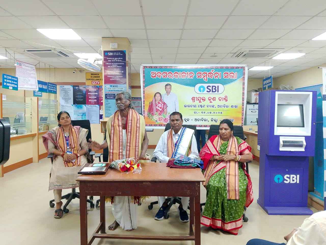 ଅତାବିରା,( ଆକାଶ ମିଶ୍ର).. ଅତାବିରା ଭାରତୀୟ ଷ୍ଟେଟ୍ ବ୍ୟାଙ୍କ, ଅତାବିରା ଶାଖା ରେ ମେସେଞ୍ଜର ପଦବୀ ରେ କାମ କରୁଥିବା କୁଶ ତାଣ୍ଡି ଆଜି ତାଙ୍କ ଚାକିରି ରୁ ଅବସର ଗ୍ରହଣ କରିଛନ୍ତି । ୧୯୮୫ ମସିହାରୁ ତାଙ୍କର ଚାକିରି ଜୀବନ ଆରମ୍ଭ ହୋଇଥିଲା । ତାଙ୍କ ତାଙ୍କ ଚାକିରି କାଳ ମଧ୍ୟରେ କୌଣସି ବ୍ୟାଙ୍କ୍ ଉପଭୋକ୍ତା ଙ୍କ ପ୍ରତି ସେ ସବୁବେଳେ ସହଯୋଗ ର ମନୋଭାବ ରଖି କାର୍ଯ୍ୟ କରୁଥିଲେ । ଅଞ୍ଚଳର ଉପଭୋକ୍ତା ମାନଙ୍କ ବ୍ୟାଙ୍କ୍ ରେ ଋଣ ପାଇଁ ହେଉ ବା ଯେ କୌଣସି କାମ ପାଇଁ ହେଉ ତାଙ୍କ ପାଖକୁ ଗଲେ ସେ ନିଜ ସାମର୍ଥ୍ୟ ମୁତାବକ ସାହାଯ୍ୟ କରିବାରେ କେବେହେଲେ ପଛ ଘୁଂଚା ଦେଇ ନଥିଲେ । ତାଙ୍କର ଏହି ଉଦାର ମନୋଭାବ ତଥା ବ୍ୟବହାର ଯୋଗୁଁ ଅଞ୍ଚଳରେ ବେଶ୍ ପ୍ରଶଂସିତ । ବ୍ୟାଙ୍କ ସମୟ ରୁ ଅଧିକ ସମୟ ରହି ସେ ବ୍ୟାଙ୍କ ର ଅନ୍ୟାନ୍ୟ କାର୍ଯ୍ୟ କରିଦେଉଥିଲେ । ଆଜି ତାଙ୍କର ଅବସର ଅବସରରେ ବ୍ୟାଙ୍କ୍ ରେ ଏକ ବିଦାୟ କାଳୀନ ସମ୍ବର୍ଦ୍ଧନା ସଭା ଅନୁଷ୍ଠିତ ହୋଇଥିଲା ବ୍ୟାଙ୍କ ଶାଖା ପ୍ରବନ୍ଧକ ସ୍ଵର୍ଣ୍ଣ ଲତା ସାହୁ ଙ୍କ ଅଧ୍ୟକ୍ଷତା ରେ ।ବ୍ୟାଙ୍କ୍ କେସିଆର୍ ରାଜେଶ୍ ନାଏକ ସଭା କାର୍ଯ୍ୟ କୁ ପରିଚାଳନା କରିଥିଲେ ।ଏହି କାର୍ଯ୍ୟ କ୍ରମରେ ମୁଖ୍ୟ ଅତିଥି ଭାବେ ଯୋଗ ଦେଇଥିଲେ ପଦ୍ମଶ୍ରୀ ହଳଧର ନାଗ । ବରିଷ୍ଠ ନାଗରିକ ବେଣୁଧର ମିଶ୍ର, ଅବସର ପ୍ରାପ୍ତ ପ୍ରାଥମିକ ଶିକ୍ଷକ ସଂଘ ର ସଭାପତି ନିଶିକାନ୍ତ ପଣ୍ଡା , ଏ ଭି ପି ମୋଟରସ୍ ର ପ୍ରୋପାଇଟର ଏମ୍ ସୁବ୍ରମଣ୍ୟମ ଦୋରା ପ୍ରମୁଖ ସମ୍ମାନିତ ଅତିଥି ଭାବେ ମଞ୍ଚାସିନ ଥିଲେ । ବ୍ୟାଙ୍କ ର ସମସ୍ତ କର୍ମଚାରୀ ତଥା ଅନେକ ଉପଭୋକ୍ତା ତାଙ୍କୁ ଶ୍ରଦ୍ଧାରେ ଉପହାର ଭେଟି ଦେଇଥିଲେ । ଅବସର ପରେ ତାଙ୍କର ପେନସନ ର ସମସ୍ତ କାଗଜପତ୍ର ତାଙ୍କୁ ହସ୍ତାନ୍ତର କରାଯାଇଥିଲା ।କର୍ମଚାରୀ ହେମନ୍ତ ମେହେର ଧନ୍ୟବାଦ୍ ଅର୍ପଣ କରିଥିଲେ ।ଏହା ପରେ ଦୁଲୁ ଦୁଲି ବାଜା, ଗଣ୍ଡା ବାଜା ଓ ଡି ଜେ ମାଧ୍ୟମରେ ଏକ ସୁସଜ୍ଜିତ ରଥରେ ତାଙ୍କୁ ଏବଂ ଟଙ୍କା ଧର୍ମ ପତ୍ନୀ ଙ୍କୁ ବିରାଜମାନ କରାଇ ଏକ ବିଶାଳ ଶୋଭାଯାତ୍ରା ବାହାରି ଥିଲା ।ଶୋଭା ଯାତ୍ରା ଟି ଅତାବିରା ସହର ସହର ପରିକ୍ରମା କରି ତାଙ୍କର ବାସ ଭବନ ଚାବିରି ପାଲି ଅଭିମୁଖେ ଯାଇ ତାଙ୍କ ଘରେ ପହଞ୍ଚିଥିଲା । ପଡ଼ା ବାସୀ ତାଙ୍କୁ ଭବ୍ୟ ସ୍ଵାଗତ କରିଥିଲେ ।ତାଙ୍କ ବାସ ଭବନରେ ସମସ୍ତ ଅତିଥି ମାନଙ୍କ ପାଇଁ ଭୂରି ଭୋଜନର ବ୍ୟବସ୍ଥା କରାଯାଇଥିଲା ।