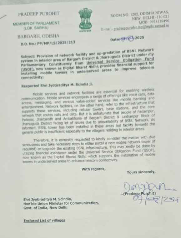 ସ୍ଥାପନକୁ ବିଶେଷ ଭାବେ ସହାୟକ ହୋଇଥାଏ । ଆଜିର ଡିଜିଟାଲ ଯୁଗରେ ମୋବାଇଲ ସେବା ଓ ନେଟୱର୍କ ନିତ୍ୟାନ୍ତ ଆବଶ୍ୟକ । କୋଟିକୋଟି ଲୋକ ମୋବାଇଲରେ କଥାବାର୍ତ୍ତା, ସୁଚନା ନେଣଦେଣ, ମେସେଜିଂ ସହ ମୋବାଇଲ ବ୍ୟାଙ୍କିଂ, ମନୋରଂଜନ ଭଳି ସେବା ପାଉଛନ୍ତି । ହେଲେ ଦୁର୍ଭାଗ୍ୟର ବିଷୟ ହେଉଛି, ବରଗଡ଼ ଜିଲ୍ଲାର ପଦ୍ମପୁର, ପାଇକମାଳ, ଝାରବନ୍ଧ ଓ ଅମ୍ବାଭୋନା ଏବଂ ଝାରସୁଗୁଡ଼ାର ଜିଲ୍ଲାର ଲଖନପୁର ବ୍ଲକରେ ବିଏସଏନଏଲ ନେଟୱର୍କ ସୁବିଧା ନାହିଁ । ଏସବୁ ଅଂଚଳରେ ବିଏସଏନଏଲ ଟାୱାର ସ୍ଥାପନା କରାଯାଇ ଥିଲେ ବି ଉପାନ୍ତ ଅଂଚଳ ପାଇଁ ଏହା ପର୍ଯ୍ୟାପ୍ତ ନୁହେଁ ବୋଲି ସାଂସଦ ଦର୍ଶାଇଛନ୍ତି । ଏହାକୁ ଗୁରୁତ୍ୱର ସହ ବିଚାରକୁ ନେଇ ପଦକ୍ଷେପ ନେବାକୁ କେନ୍ଦ୍ରମନ୍ତ୍ରୀଙ୍କୁ ସେ ଅନୁରୋଧ କରିଛନ୍ତି । ଆବଶ୍ୟକ ସ୍ଥାନରେ ନୂଆ ମୋବାଇଲ ଟାୱାର ସ୍ଥାପନା ବା ବିଏସଏନଏଲ ଭିତ୍ତିଭୂମିକୁ ଅପଗ୍ରେଡେସନ କରାଯାଉ ବୋଲି ସାଂସଦ କେନ୍ଦ୍ରମନ୍ତ୍ରୀ ଜ୍ୟୋତିରାଦିତ୍ୟ ସିନ୍ଧିଆଙ୍କୁ କହିଛନ୍ତି ।