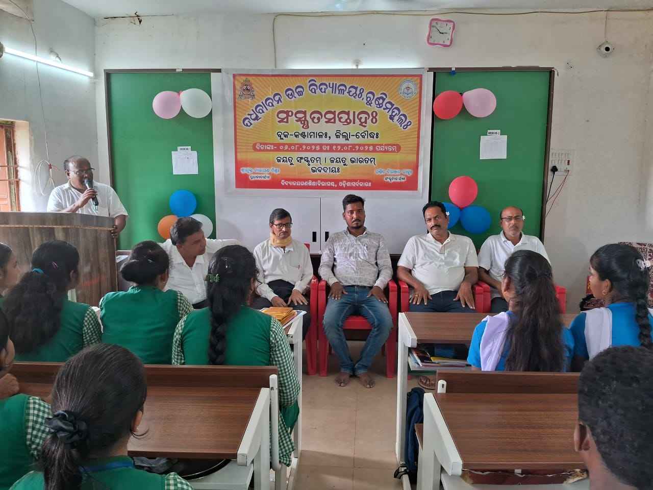ପ୍ରଶାନ୍ତ କୁମାର ଶୁକ୍ଳ, ସୁଶାନ୍ତ କୁମାର ରଥ, ଚିତ୍ତରଞ୍ଜନ ସାହୁ ପ୍ରମୁଖ ଯୋଗଦେଇ ମନୁଷ୍ୟ ଜୀବନରେ ସଂସ୍କୃତର ଉପାଦେୟତା ଓ ଆବଶ୍ୟକତା ବିଷୟରେ ସାରଗର୍ଭକ ବକ୍ତବ୍ୟ ପ୍ରଦାନ କରିଥିଲେ l ବିଦ୍ୟାଳୟ ପ୍ରଧାନଶିକ୍ଷକ ନାରାୟଣ ମିଶ୍ର ସଭାକୁ ସଭାପତିତ୍ୱ କରିଥିଲେ l ଏହି ଅବସରରେ ପୂର୍ବରୁ ଛାତ୍ରଛାତ୍ରୀମାନଙ୍କ ମଧ୍ୟରେ ହୋଇଥିବା ସଂସ୍କୃତ ସ୍ଲୋକାବୃତି ପ୍ରତିଯୋଗିତାର କୃତି ପ୍ରତିଯୋଗୀ ମାନଙ୍କୁ ମାନପତ୍ର ସହିତ ଉପଢୌକନ ପ୍ରଦାନ କରାଯାଇଥିଲା l ବିଦ୍ୟାଳୟ ର ମାର୍କଣ୍ଡ ନାଗ, ସୁକାନ୍ତି ଦେହୁରୀ ସମେତ ସମସ୍ତ ଛାତ୍ରଛାତ୍ରୀ ମାନେ ସହଯୋଗ କରିଥିଲେ l