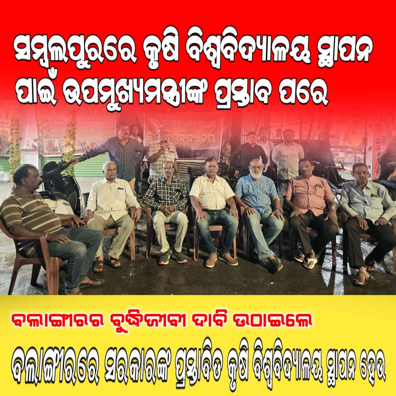 ବଲାଙ୍ଗୀର (ପ୍ରେରଣା ଖବର): ଶିଳ୍ପବିହୀନ ଦାଦନ ପ୍ରବଣ ବଲାଙ୍ଗୀର ଜିଲ୍ଲା ରେ ରାଜ୍ୟର ଦ୍ୱିତୀୟ କୃଷି ବିଶ୍ୱ ବିଦ୍ୟାଳୟ ପ୍ରତିଷ୍ଠା ପାଇଁ ଦୀର୍ଘ ବର୍ଷରୁ ଦାବୀ ହୋଇଆସୁଅଛି lବର୍ତ୍ତମାନ ସମ୍ବଲପୁର ଠାରେ କୃଷି ବିଶ୍ୱ ବିଦ୍ୟାଳୟ ଏବଂ ବଲାଙ୍ଗୀର ଠାରେ କୃଷି ମହାବିଦ୍ୟାଳୟ ପ୍ରତିଷ୍ଠା ପାଇଁରାଜ୍ୟ ସରକାର ନୀତିଗତ ଭାବେ ଘୋଷଣା କରିବା ପ୍ରସଙ୍ଗଣମାଧ୍ୟମରେ ପ୍ରକାଶ ପାଇଛି l ଏହାର ପ୍ରତିକ୍ରିୟା ସ୍ୱରୂପ ବଲାଙ୍ଗୀରରେ ବ୍ୟାପକ ଆଲୋଡନ ସୃଷ୍ଟି ହୋଇ ସମ୍ପୃକ୍ତ ଘୋଷଣାନାମାକୁ ପ୍ରତ୍ୟାଖ୍ୟାନ କରାଯାଇଛି lଏହାର ପ୍ରତିବାଦରେ ବଲାଙ୍ଗୀର ବୁଦ୍ଧିଜୀବୀ ମାନଙ୍କ ପକ୍ଷରୁ ସ୍ଥାନୀୟ ଭାଗିରଥି ଛକଠାରେ ଏକ ପଥପ୍ରାନ୍ତସଭା ରେ
