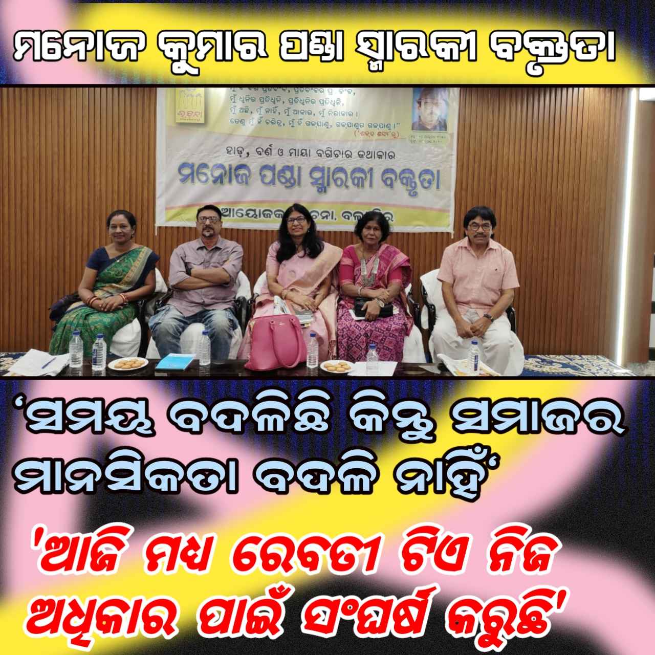 ସମୟ ବଦଳିଛି କିନ୍ତୁ ସମାଜର ମାନସିକତା ବଦଳି ନାହିଁ l ଆଜି ମଧ୍ୟ ରେବତୀ ଟିଏ ନିଜର ଅଧିକାର ପାଇଁ ସଙ୍ଘର୍ଷ କରୁଛି l ରେବତୀ ନିଜ ଘର ଲୋକଙ୍କ ଦ୍ୱାରା ନିର୍ଯାତିତ ହେଉଥିଲା ଏବେକାର ରେବତୀ ମାନେ ସମାଜଦ୍ୱାରା ନିର୍ଯାତିତ ହେଉଛନ୍ତି l ନାରୀଟିଏ ତାର ଅଧିକାର ପାଇଁ ଲଢ଼ିବ କାହିଁକି ? ଯାହା ତାର ପ୍ରାପ୍ୟ ତାହାସେ ପାଇବା ଉଚିତ l ଏଥିପାଇଁ ଆବଶ୍ୟକ ମାନସିକତାରେ ପରିବର୍ତ୍ତନ l ବଲାଙ୍ଗୀର ର ଅଗ୍ରଣୀ ସାହିତ୍ୟ ସାମାଜିକ ଓ ସାଂସ୍କୃତିକ ଅନୁଷ୍ଠାନ ରଚନା ଦ୍ୱାରା ଆୟୋଜିତ ମନୋଜ କୁମାର ପଣ୍ଡା ସ୍ମାରକୀ ବକ୍ତୃତା ଓ ସର୍ଜନ ପୁରସ୍କାର ସମାରୋହ ରେ ଏହିମତ ପ୍ରକାଶ ପାଇଛି l