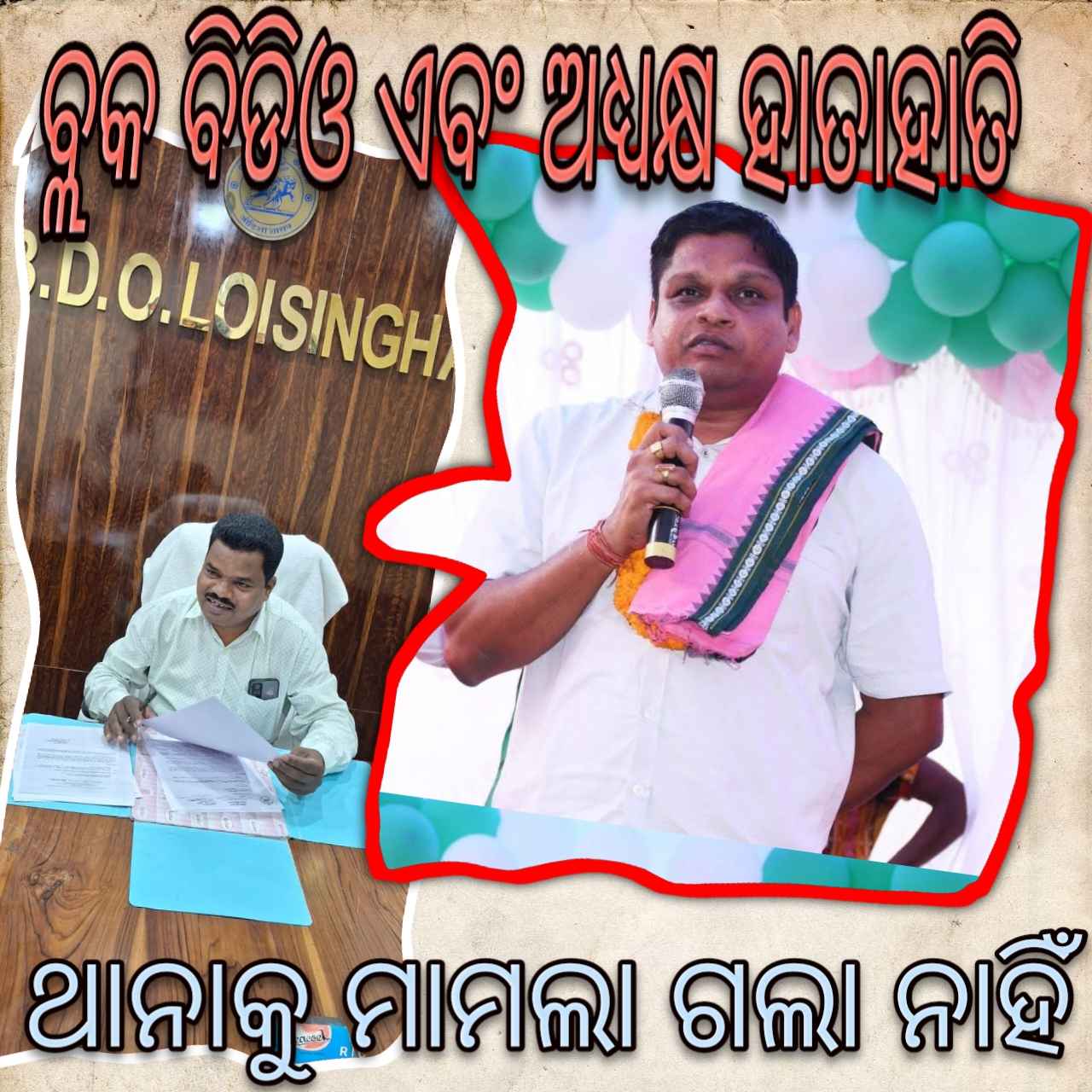 ତିନିଦିନ ତଳେ ବଲାଙ୍ଗୀର ଜିଲ୍ଲାର ଅନ୍ୟତମ ରାଜନୈତିକ ସମ୍ବେଦନଶୀଳ ବ୍ଲକ୍ ଲୋଇସିଂହା ବ୍ଲକର ଅଧ୍ୟକ୍ଷ ଓ ବିଡିଓଙ୍କ ମଧ୍ଯରେ ଖୋଲାଖୋଲି ଉଚ୍ଚସ୍ଵରରେ ବଚସା ସହିତ ହାତାହାତି ହେବା ଘଟଣା ଘଟିଯାଇଛି । ଗଣମାଧ୍ୟମରେ ପ୍ରକାଶ ପାଇ ଏହା ଚର୍ଚ୍ଚିତ ହୋଇପଡିଥିଲେ ହେଁ , ଉଭୟ ପକ୍ଷରୁ ଏ ସମ୍ପର୍କରେ ସ୍ଥାନୀୟ ଥାନାରେ ଏତଲା ଦିଆ ନଯିବା କୌତୁହଳ ସୃଷ୍ଟି କରିଛି ।