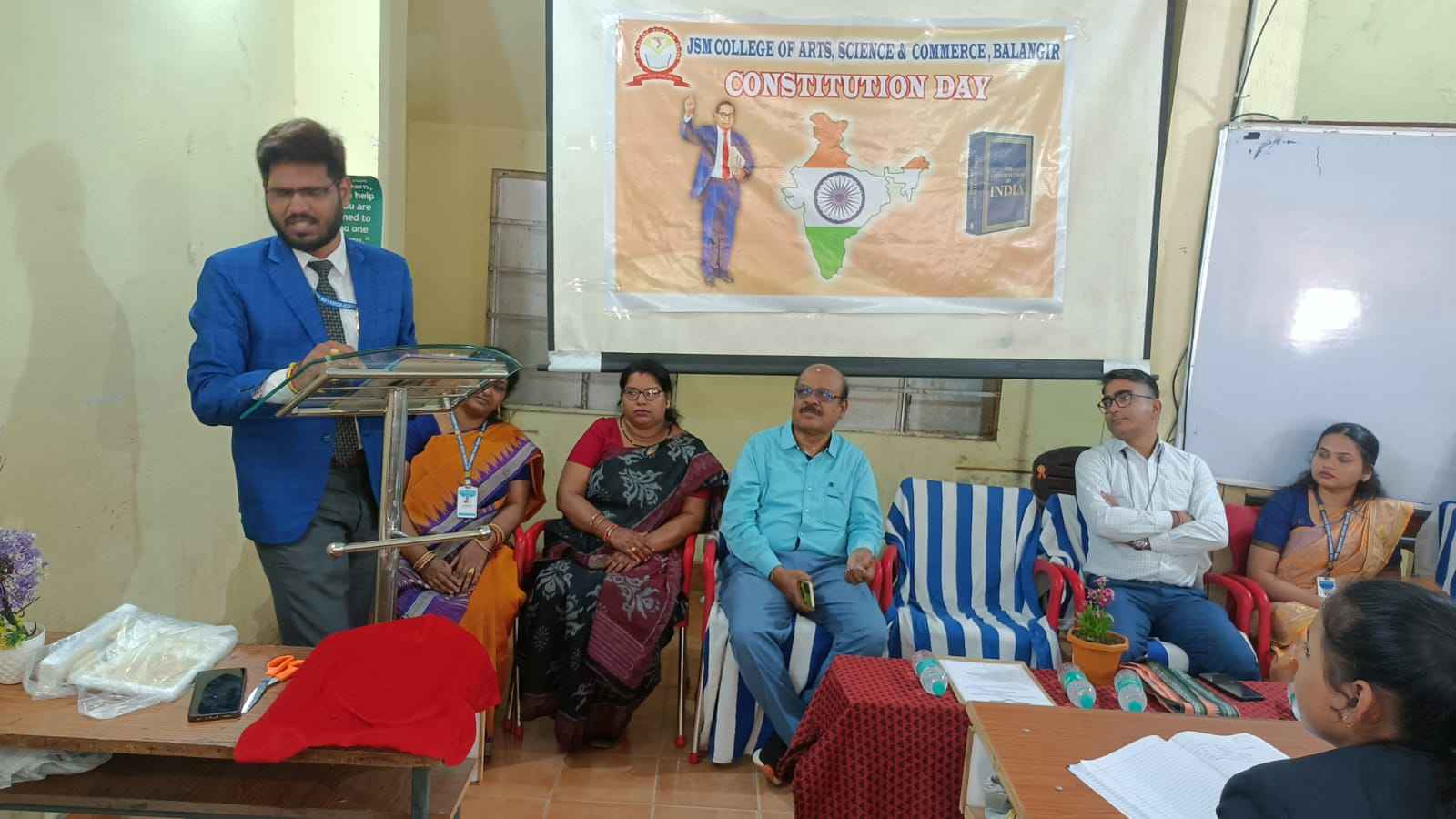 ବଲାଙ୍ଗୀର, ଆଜି ଜେଏସ୍ଏମ୍ ଆର୍ଟସ, କମର୍ସ ଏଣ୍ଡ ସାଇନ୍ସ କଲେଜ ଆନୁକୂଲ୍ୟରେ ସମ୍ବିଧାନ ଦିବସ ପାଳିତ ହୋଇ ଯାଇଛି l କଲେଜର ଅଧ୍ୟକ୍ଷ ଡ. ମନସ୍ମିତା ମିଶ୍ରଙ୍କ ସଭାପତିତ୍ୱରେ ଅନୁଷ୍ଠିତ ଏହି ଉତ୍ସବରେ ମୁଖ୍ୟ ଅତିଥି ଭାବରେ ସ୍ଥାନୀୟ ଯୁଧିଷ୍ଟିର ମିଶ୍ର ଆଇନ ମହାବିଦ୍ୟାଳୟର ପ୍ରଫେସର ଚଣ୍ଡିପ୍ରସାଦ ଖମାରୀ ଯୋଗ ଦେଇ ସମ୍ବିଧାନର ଜନକ ଡ. ଭୀମରାଓ ଆମ୍ବେଦକରଙ୍କ ଫଟୋଚିତ୍ରରେ ମାଲ୍ୟାର୍ପଣ ଓ ପ୍ରଦୀପ ପ୍ରଜ୍ୱଳନ କରି ସଭାକୁ ଉଦ୍ଘାଟନ କରିଥିଲେ । ମୁଖ୍ୟ ଅତିଥି ଶ୍ରୀ ଖମାରୀ ନିଜ ବକ୍ତବ୍ୟରେ