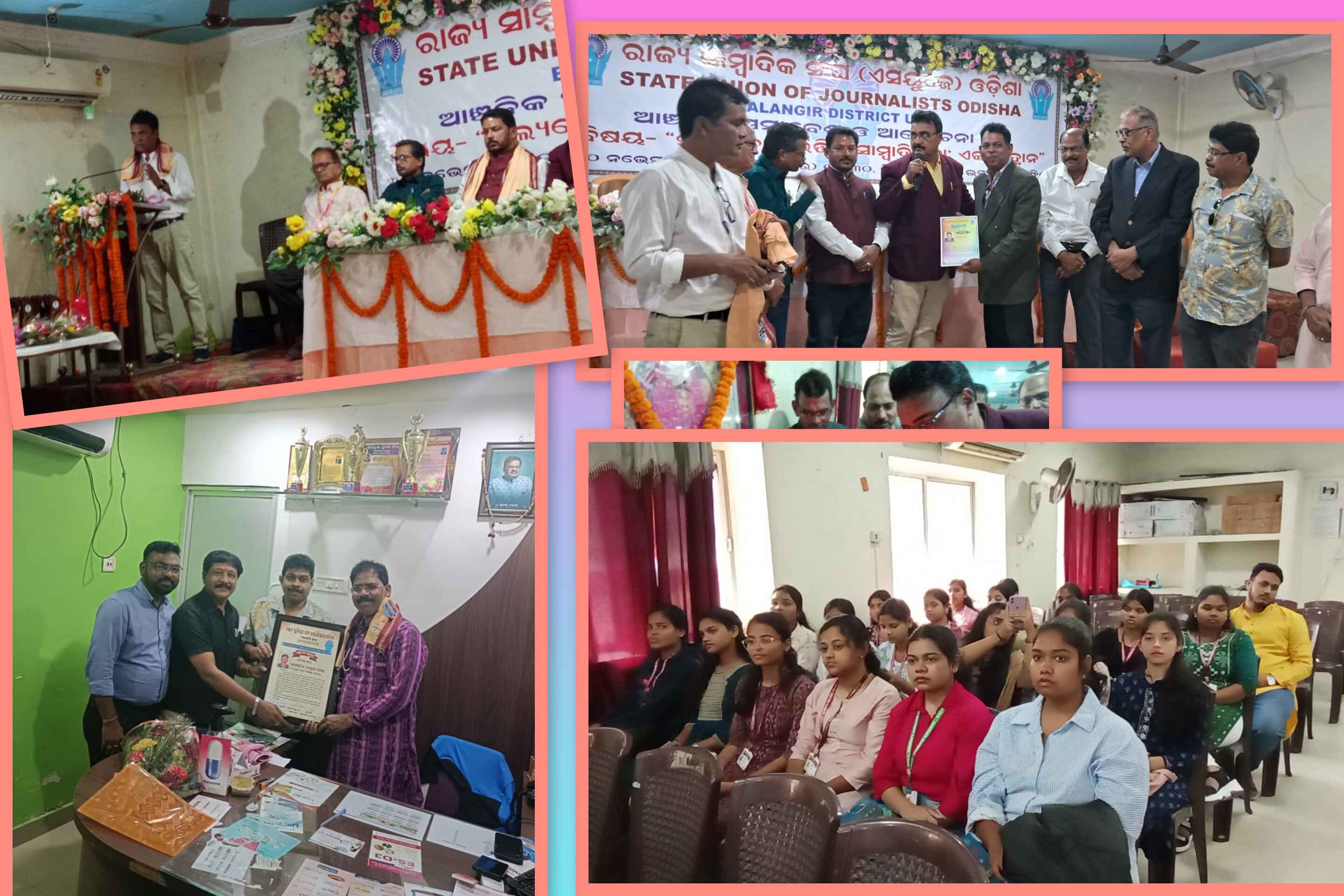 ରଘୁ ନନ୍ଦନ ସିଂହ, ସମ୍ପାଦକୀୟ ବିବରଣୀ ପ୍ରଦାନ କରିଥିଲେ l ସମାବେଶରେ ମୁଖ୍ୟ ଅତିଥି ଭାବେ ବଲାଙ୍ଗିର ପୌରଧ୍ୟକ୍ଷା ଶ୍ରୀମତୀ ଲିକା ସାହୁ ଯୋଗ ଦେଇ ସମାଜରେ ସକାରାତ୍ମକ ପରିବର୍ତ୍ତନ ଦିଗରେ ସାମ୍ବାଦିକ ମାନଙ୍କ ଅବଦାନ ସମ୍ପର୍କରେ ଆଲୋଚନା କରିଥିଲେ l ବଲାଙ୍ଗିର ମହିଳା ମହାବିଦ୍ୟାଳୟର ଅଧ୍ୟକ୍ଷ ଡ.ଅରବିନ୍ଦ ଓଝା ଯୋଗଦେଇ ମୂଲ୍ୟବୋଧ ସାମ୍ବାଦିକତାର ବିଭିନ୍ନ ଦିଗ ଉପରେ ଆଲୋକପାତ କରିଥିଲେ l ଏହି ଆଲୋଚନାରେ ବଲାଙ୍ଗୀର ସରକାରୀ ମହିଳା ମହାବିଦ୍ୟାଳୟ ର ଜର୍ଣ୍ଣାଲିଜମ୍ ବିଭାଗର ଛାତ୍ରୀ ମାନେ ଭାଗ ନେଇଥିଲେ l ଏହି ଅବସରରେ ସାମ୍ବାଦିକ ବଳରାମ ମିଶ୍ର, ଚନ୍ଦ୍ରଭାନୁ ମୌଲାନା, ପ୍ରବୀଣ ପୁରୋହିତ, ରଶ୍ମିରଞ୍ଜନ ପଟ୍ଟନାୟକ, ଖବରକାଗଜ ବିତରକ ଜୟପ୍ରକାଶ ମଟାରୀ, ଡାକ୍ତର ବେଣୁଧର ପାଣ୍ଡେ, ଉଦ୍ୟୋଗୀ ମହିଳା ମୀରା ଦେବୀ କେଜରିୱାଲ ଓ ସୁଜାତା ଅଗ୍ରୱାଲଙ୍କୁ ଏସ୍ ୟୁ ଜେ ତରଫରୁ ମାନପତ୍ର ଓ ଉପଢ଼ୌକନ ଦେଇ ସମ୍ବର୍ଦ୍ଧିତ କରାଯାଇଥିଲା l ସମାବେଶର ମୁଖ୍ୟ ଆକର୍ଷଣ ତଥା ସଂଘର ବଳିଷ୍ଠ ନେତୃତ୍ୱ ବହନ କରିଥିବା ଷ୍ଟେଟ୍ ୟୁନିୟନ୍ ଅଫ ଜର୍ଣାଲିଷ୍ଟ (ଓଡ଼ିଶା)ର ରାଜ୍ୟ ସଭାପତି କୈଳାସ ଚନ୍ଦ୍ର ନାୟକ ସାମ୍ବାଦିକ ଏକତା, ସୁରକ୍ଷା, ପେନସନ ଓ ଵୀମାରାଶି ବୃଦ୍ଧି ନିମନ୍ତେ ରାଜ୍ୟ ସରକାରଙ୍କ ଦୃଷ୍ଟି ଆକର୍ଷଣ କରିଥିବା ସମ୍ପର୍କରେ ଅନେକ ତଥ୍ୟ ଉପସ୍ଥାପନା କରିଥିଲେ।ଜିଲ୍ଲା ରାଜ୍ୟ ଉପ ସଭାପତି ମହେନ୍ଦ୍ର କୁମାର ଦର୍ଜି ଅତିଥି ପରିଚୟ ପ୍ରଦାନ କରିଥିଲେ।