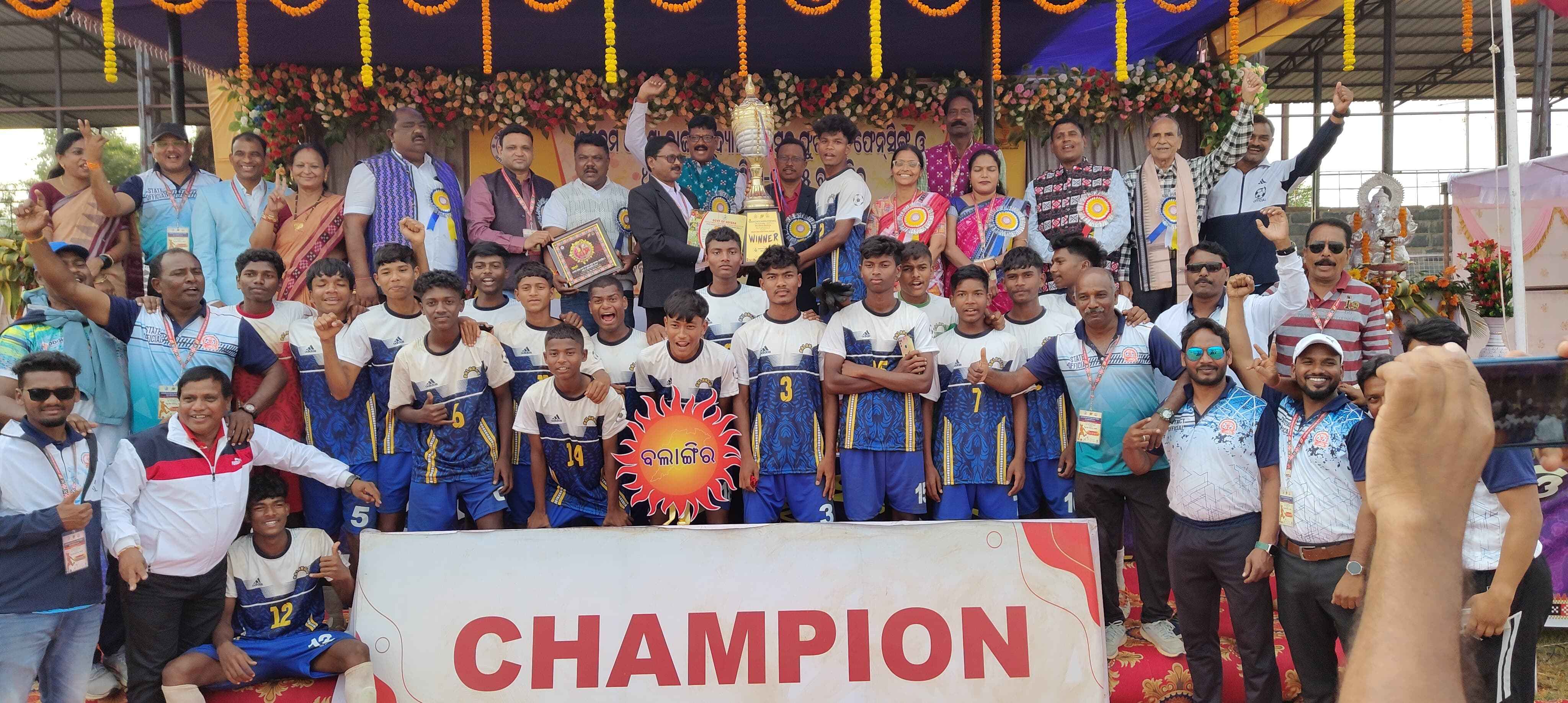 ବଲାଙ୍ଗୀର(ପ୍ରେରଣା ଖବର)- ଗତ ୨୭ତାରିଖରୁ ଆରମ୍ଭ ହୋଇଥିବା ୬୯ତମ ଓଡିଶା ରାଜ୍ୟ ବିଦ୍ୟାଳୟ ସମୂହ ୧୭ ବର୍ଷରୁ କମ ବାଳକ ବର୍ଗ ଫୁଟବଲ ମ୍ୟାଚ ର ଫାଇନାଲ ମ୍ୟାଚ ହର୍ଷୋଉଲ୍ଲାସର ସହ ଗାନ୍ଧୀ ଷ୍ଟାଡିୟମ ଠାରେ ସମାପନ ହୋଇ ଯାଇଛି।ମିଶନ ପଡିଆ ଠାରେ ଅନୁଷ୍ଠିତ ହୋଇଥିବା ପ୍ରଥମ ସେମିଫାଇନାଲ ମ୍ୟାଚ ରେ ଢେଙ୍କାନାଳ ଦଳକୁ ମୟୁରଭଞ୍ଜ ଦଳ ୨-୦ରେ ପରାସ୍ତ କରି ଫାଇନାଲ କୁ ଉନ୍ନୀତ ହୋଇଥିବା ବେଳେ ଆର.ଏନ ସିଂ ଦେଓ ସ୍ପୋର୍ଟ୍ସ କଂପ୍ଲେକ୍ସ ଠାରେ ଅନୁଷ୍ଠିତ ହୋଇଥିବା ଦ୍ଵିତୀୟ ସେମିଫାଇନାଲ ମ୍ୟାଚରେ ବଲାଙ୍ଗୀର ଦଳ କେନ୍ଦୁଝର ଦଳକୁ ୩-୨ରେ ପରାସ୍ତ କରି ଫାଇନାଲ କୁ ପ୍ରବେଶ କରିଥିଲା।ସେମିଫାଇନାଲ ମ୍ୟାଚ ର ଉଭୟ ବିଜେତା ବଲାଙ୍ଗୀର ଓ ମୟୁରଭଞ୍ଜ ଦଳ ଙ୍କ ମଧ୍ୟରେ ସ୍ଥାନୀୟ ଗାନ୍ଧୀ ଷ୍ଟାଡିୟମ ଠାରେ ମଧ୍ୟାହ୍ନ ୧୨ ଟାରେ ଫାଇନାଲ ମ୍ୟାଚ ଅନୁଷ୍ଠିତ ହୋଇଥିଲା।ମ୍ୟାଚ ର ପ୍ରଥମାର୍ଦ୍ଧରୁ ହିଁ ଆକ୍ରମଣାତ୍ମକ ଖେଳ ଦେଖାଇଥିବା ବଲାଙ୍ଗୀର ଓ ମୟୁରଭଞ୍ଜ ଦଳ ତୀବ୍ର ଆକ୍ରମଣ ସହିତ ଖେଳକୁ ନିଜ ନିଜ ନିୟନ୍ତ୍ରଣ ରେ ରଖିଥିଲେ।ଦୁହି ପକ୍ଷର ସମାନ ସଂଘର୍ଷ ଫଳରେ ଖେଳ ନିର୍ଦ୍ଧିଷ୍ଟ ସମୟରେ ୦-୦ ରେ ସମାପ୍ତ ହେଲା।ମ୍ୟାଚ ର ଫଳାଫଳ ନିର୍ଣ୍ଣୟ ପାଇଁ ଟାଇ ବ୍ରେକର କରାଯାଇଥିଲା।ଦୁହି ଦଳ ତୀବ୍ର ଚାପରେ ଥିବା ସମୟରେ ଦକ୍ଷତା ଓ ସ୍ଥିରତା ଦେଖାଇ ବଲାଙ୍ଗୀର ଦଳ ଚମତ୍କାର ପ୍ରଦର୍ଶନ କଲା।ଟାଇ ବ୍ରେକର ର ରୋମାଞ୍ଚକର ମୁହୁର୍ତ୍ତ ରେ ପେନାଲ୍ଟି ରେ ବଲାଙ୍ଗୀର ଦଳ ମୟୁରଭଞ୍ଜ ଦଳକୁ ୩-୨ଗୋଲରେ ପରାସ୍ତ କରି ଚଳିତ ବର୍ଷର ରାଜ୍ୟ ବିଦ୍ୟାଳୟ ସମୂହ ୧୭ବର୍ଷରୁ କମ ବାଳକ ବର୍ଗ ର ଫୁଟବଲ ଚାମ୍ପିୟାନସିପ ହାସଲ କଲା।ପୁରସ୍କାର ବିତରଣ ସମାରୋହ ବଲାଙ୍ଗୀର ଜିଲ୍ଲା ଶିକ୍ଷା ଅଧିକାରୀ ପ୍ରଦୀପ ନାଗଙ୍କ ସଭାପତିତ୍ୱରେ ଅନୁଷ୍ଠିତ ହୋଇଥିଲା। ମୁଖ୍ୟ ଅତିଥି ରୂପେ ଅତିରିକ୍ତ ଜିଲ୍ଲାପାଳ ପବିତ୍ର ବେହେରା,ନିମନ୍ତ୍ରିତ ଅତିଥି ରୂପେ ବଲାଙ୍ଗୀର ପୌରସଂସ୍ଥାର କାର୍ଯ୍ୟନିର୍ବାହୀ ଅଧିକାରୀ ସନ୍ତୋଷ କୁମାର ବେହେରା,ଶାରୀରିକ ଶିକ୍ଷା ନିର୍ଦ୍ଦେଶକ ଜ୍ୟୋତି ପ୍ରସାଦ ପରିଡା, ଜିଲ୍ଲା କ୍ରୀଡା ସଂସଦ କାର୍ଯ୍ୟକାରୀ ସଭାପତି ଡ.ଶ୍ରୀକର ମିଶ୍ର,ଜିଲ୍ଲା କ୍ରୀଡା ସଂସଦ ସାଧାରଣ ସମ୍ପାଦକ ହରି ନାରାୟଣ