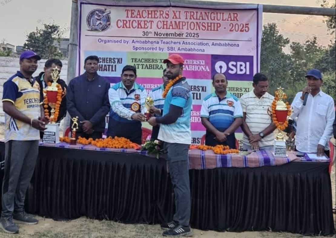 ବରଗଡ଼(ପ୍ରେରଣା ଖବର): ବରଗଡ଼ ଜିଲ୍ଲା ଅମ୍ବାଭୋନା ବ୍ଲକର ଶିକ୍ଷା ଓ ଶିକ୍ଷକ ପରିବାର ଏବଂ ଷ୍ଟେଟ ବ୍ୟାଙ୍କ ଅଫ ଇଣ୍ଡିଆ, ଅମ୍ବାଭୋନା ଶାଖା ତରଫରୁ ଅତାବିରା,ଅମ୍ବାଭୋନା ଓ ଭଟଲି ବ୍ଲକ ମଧ୍ୟରେ ଶିକ୍ଷକ ଏକାଦଶ ଏକଦିବସୀୟ ତ୍ରିମୁଖୀ କ୍ରିକେଟ ଟୁର୍ଣ୍ଣାମେଣ୍ଟ - ୨୦୨୫ କେଦାରନାଥ ଷ୍ଟାଡିୟମ଼ ଅମ୍ବାଭୋନାରେ ଅନୁଷ୍ଠିତ ହୋଇଯାଇଛି। ଏହି ଅବସରରେ ଏବିଇଓ ଲାଲ ମୋହନ ସିଂହଙ୍କ ସଭାପତିତ୍ବରେ ଅନୁଷ୍ଠିତ ଉଦଘାଟନୀ ସମାରୋହରେ ମୁଖ୍ଯଅତିଥି ଭାବେ ଅତିରିକ୍ତ ଜିଲ୍ଲା ଶିକ୍ଷା ଅଧିକାରୀ ସରୋଜ କୁମାର ଭୁଏ ଯୋଗଦେଇଥିବା ବେଳେ ମୁଖ୍ଯ ବକ୍ତା ଭାବରେ ବ୍ଲକ ବିଜ୍ଞାନ ଫୋରମର ସଭାପତି ସଞ୍ଜୟ ଖମାରୀ ଓ ସମ୍ମାନିତ ଅତିଥି ଭାବରେ ଡିପିଇଓ ଜ୍ୟୋତିଷ ଚନ୍ଦ୍ର ପଧାନ ଓ ଏସଜିଏସଏ ତୋଷରାମ ଦାଶ ଯୋଗ ଦେଇଥିଲେ। ଏହି ବନ୍ଧୁତ୍ୱପୂର୍ଣ୍ଣ ମ୍ୟାଚରେ ଅଂଶଗ୍ରହଣ କରିଥିବା ଅମ୍ବାଭୋନା, ଅତାବିରା ଓ ଭଟଲିର ପ୍ରତିଭା ସମ୍ପନ୍ନ ଶିକ୍ଷକ ଏକାଦଶଙ୍କ କ୍ରିକେଟ ଖେଳ ସମସ୍ତଙ୍କ ହୃଦୟକୁ ଛୁଇଁ ପାରିଥିଲା। ସିଆରସିସି ବଳରାମ ଦରଦ ମେଘ,ବୁବୁନ ପଣ୍ଡା ଓ ସନ୍ତୋଷ ମାଝୀ ମ୍ୟାଚର ଧାରା ବିବରଣୀ ପ୍ରଦାନ କରିଥିଲେ।ଏଥିରେ ଅମ୍ପାୟାର ଭାବରେ ଶେଷଦେବ ଦାସ ଓ ଯୋଗେଶ୍ବର ସେଠ ଖେଳ ପରିଚାଳନା କରିଥିଲେ।ଅମ୍ବାଭୋନା ବ୍ଲକର ସମସ୍ତ ସିଆରସିସି ସହଯୋଗ କରିଥିଲେ। ଉଦଯାପନୀ ସମାରୋହରେ ଏବିଇଓ ଲାଲମୋହନ ସିଂହଙ୍କ ସଭାପତିତ୍ବରେ ଅନୁଷ୍ଠିତ ପୁରସ୍କାର ବିତରଣୀ ଉତ୍ସବରେ ମୁଖ୍ଯ ଅତିଥି ଭାବରେ ବ୍ଲକ ବିଜ୍ଞାନ ଫୋରମର ସଭାପତି ସଞ୍ଜୟ ଖମାରୀ ଏବଂ ସମ୍ମାନିତ ଅତିଥି ଭାବରେ ପ୍ରାଥମିକ ଶିକ୍ଷକ ସଂଘର ବ୍ଲକ ଉପ ସଭାପତି ରୋହିତ ଭୁଏ ଯୋଗଦେଇ ବିଜେତା ଦଳ ଅତାବିରା ଶିକ୍ଷକ ଏକାଦଶ ଓ ଉପବିଜେତା ଦଳ ଭଟଲି ଶିକ୍ଷକ ଏକାଦଶଙ୍କୁ ପୁରସ୍କୃତ କରିଥିଲେ । ମେନ ଅଫ ଦି ମ୍ୟାଚ ଛବିଳ ପ୍ରଧାନ ଓ ମ୍ଯାନ ଅଫ ଦ ଟୁର୍ଣ୍ଣାମେଣ୍ଟ ବ୍ଯାସଦେବ ସାହୁଙ୍କୁ ପୁରସ୍କୃତ କରିଥିଲେ । ତିନି ଦଳର