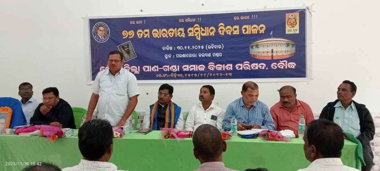 କଣ୍ଟାମାଳ(ଜୟ କୁମାର ମହାରଣା): ବୌଦ୍ଧ ଜିଲ୍ଲା ପାଣ - ଗଣ୍ଡା ସମାଜ ବିକାଶ ପରିଷଦ ପକ୍ଷରୁ କଣ୍ଟାମାଳ ବ୍ଲକ ପଲଶାଗୋରା କଲ୍ୟାଣ ମଣ୍ଡପ ଠାରେ ଦପଲା ପଞ୍ଚାୟତର ପୂର୍ବତନ ସମିତି ସଭ୍ୟ ତଥା ସଂଗଠନର ବରିଷ୍ଠ ଉପ ସଭାପତି ମକରଧ୍ବଜ ମହାନନ୍ଦିଆ ଙ୍କ ଅଧ୍ୟକ୍ଷତାରେ ୭୬ ତମ " ଭାରତୀୟ ସମ୍ବିଧାନ ଦିବସ " ପାଳିତ ହୋଇଯାଇଛି । କାର୍ଯ୍ୟକ୍ରମ ପ୍ରାରମ୍ଭରେ ସମ୍ବିଧାନ ପ୍ରଣେତା ବାବାସାହେବ ଆମ୍ବେଦକର ଙ୍କ ଫୋଟ ଚିତ୍ରରେ ପ୍ରଦୀପ ପ୍ରଜ୍ଜ୍ୱଳନ ତଥା ପୁଷ୍ପମାଲ୍ୟ ଅର୍ପଣ ପରେ ସଂଗଠନର ଜିଲ୍ଳା ସାଧାରଣ ସମ୍ପାଦକ ସୁଧାଂଶୁ ଡାଙ୍ଗ ବୈଠକର ଉଦ୍ଦେଶ୍ୟ ଜ୍ଞାପନ କରିବା ସହିତ ସାମ୍ବିଧାନିକ ଅଧିକାର ଉପରେ ଆଲୋକପାତ କରିଥିଲେ । କନ୍ଧମାଳ ଜିଳ୍ଲାର ବିଶିଷ୍ଟ ସମାଜସେବୀ ସୂଜନ ବେହେରା ମୂଖ୍ୟ ଅତିଥି ଭାବେ ଯୋଗଦେଇ ଓଡିଶାର ନକଲି ଦେୱାର ତଥା କେଉଟ , ଧୀବର , କୈବର୍ତ୍ତ ( କେ ଡି କେ ) ମାନଙ୍କୁ ଅନୁସୂଚିତ ଜାତି ତାଲିକାରୁ ହଟାଇବା ସହିତ ଭାରତୀୟ ସମ୍ବିଧାନ ଉପରେ ଗୁରୁତ୍ୱାରୋପ କରିଥିଲେ । କନ୍ଧମାଳ ଜିଲ୍ଲାର ବରିଷ୍ଠ ସମାଜସେବୀ ତଥା ଆମ୍ବେଦକରର ସ୍ମୃତି କମିଟି ର ସାଧାରଣ ସମ୍ପାଦକ ଡ଼ଃ ସୋମନାଥ ବାଘ ମୁଖ୍ୟବକ୍ତା ଭାବେ ଯୋଗଦେଇ ଓଡ଼ିଶା ର ନକଲି ଦେୱାର ମାନଙ୍କ ଅନୁସୂଚିତ ଜାତି ତାଲିକା ରେ ଅସାମ୍ବିଧାନିକ ତଥା ଅଗଣତାନ୍ତ୍ରିକ ଭାବେ ସାମିଲ ସହିତ ଅନୁପ୍ରବେଶ କରି ହଡ଼ପ କରୁଥିବା ସାମ୍ବିଧାନିକ ଅଧିକାର ଉପରେ ଗୁରୁତ୍ୱାରୋପ କରିଥିଲେ । ସୁବର୍ଣ୍ଣପୁର ଜିଲ୍ଲାର ବିଶିଷ୍ଟ ଶିକ୍ଷାଵିତ କ୍ଷୀରସାଗର ବିଭାର ସମ୍ମାନୀତ ବକ୍ତା ଭାବେ ଯୋଗଦେଇ ନ୍ୟାୟିକ ବ୍ୟବସ୍ଥା ସହିତ ରାଜରାସ୍ତାରେ ଗଣତାନ୍ତ୍ରିକ ପଦ୍ଧତିରେ ଆରକ୍ଷଣ ର ସୁରକ୍ଷା ଉପରେ ଲଢ଼େଇ ଜାରି ରଖିବାକୁ ଉପସ୍ଥିତ କାର୍ଯ୍ୟକର୍ତ୍ତା ଙ୍କୁ ପରାମର୍ଶ ଦେଇଥିଲେ । ବୌଦ୍ଧ ଜିଲ୍ଲାର ବରିଷ୍ଠ ସମାଜସେବୀ ତଥା ଅବସରପ୍ରାପ୍ତ ଗ୍ରାମ ପଞ୍ଚାୟତ ସମ୍ପ୍ରସାରଣ ଅଧିକାରୀ ଶମ୍ଭୁ ପ୍ରସାଦ ମହାନନ୍ଦିଆ ଏବଂ ବୌଦ୍ଧ ଜିଲ୍ଲାର ବରିଷ୍ଠ ସମାଜସେବୀ ତଥା ଅବସରପ୍ରାପ୍ତ ବରିଷ୍ଠ ରାଜସ୍ବ ଅଧିକାରୀ ଦୀନବନ୍ଧୁ ସୁନା ସମ୍ମାନୀତ ଅତିଥି ଭାବେ ଯୋଗଦେଇ ସଂଗଠନ କୁ ସୁଦୃଡ଼ କରିବା ସହିତ କେ ଡି କେ ମାନଙ୍କୁ ଅନୁସୂଚିତ ଜାତି ତାଲିକାରୁ ସଂପୂର୍ଣ୍ଣ ହଟାଇବା ପାଇଁ ଜୋରଦାର ଲଢେ଼ଇ କରିବାକୁ ମତବ୍ୟକ୍ତ କରିଥିଲେ । ଉକ୍ତ କାର୍ଯ୍ୟକ୍ରମରେ ସ୍ୱତନ୍ତ୍ର ନିମନ୍ତ୍ରିତ ଅତିଥି ଭାବେ ସଂଗଠନର ସହକାରୀ କୋଷାଧ୍ୟକ୍ଷ ଶ୍ରୀନିବାସ ହାତୀ , ଯୁଗ୍ମ ସମ୍ପାଦକ ମାର୍କଣ୍ଡ କଲତା , ଜିଲ୍ଲା କାର୍ଯ୍ୟକାରିଣୀ ସଦସ୍ୟ ଧରଣୀଧର ବିଭାର , ବିଶ୍ଵନାଥ ସୁନା , ଜ୍ୟୋତି ରଞ୍ଜନ ମହାନନ୍ଦ ଯୋଗଦେଇ ବାବାସାହେବ ଙ୍କ ସାମ୍ବିଧାନିକ ଅଧିକାର ଏବଂ ଅନୁସୂଚିତ ଜାତି ତାଲିକା ରେ କେ ଡି କେ ମାନଙ୍କ ଅନାଧିକାର ପ୍ରବେଶ ଉପରେ ଆଲୋକପାତ କରିଥିଲେ । ଅନ୍ୟମାନଙ୍କ ମଧ୍ୟରେ ସଂଗଠନର ପଲଶାଗୋରା ପଞ୍ଚାୟତ କମିଟି ସଭାପତି ନରେନ୍ଦ୍ର ଦୀପ , ସମ୍ପାଦକ ପିତାମ୍ବର ବିଭାର , ବରଗାଁ ପଞ୍ଚାୟତ କମିଟି ସଭାପତି ପରମେଶ୍ବର ଛତ୍ରିଆ , ସମ୍ପାଦକ ସୁବାଷ ମହାନନ୍ଦ , ରୁଣ୍ଡିମହୁଲ ପଞ୍ଚାୟତ ବ୍ଲକ ସଂଯୋଜକ ରାଜେନ୍ଦ୍ର ବାଘ , ସମ୍ପାଦକ ପୁରୁଷୋତ୍ତମ ନାଗ , କଣ୍ଟାମାଳ ବ୍ଲକ ସଂଯୋଜକ ରୁଦ୍ର ପ୍ରସାଦ କୁମ୍ଭାର , ବରିଷ୍ଠ ସମାଜସେବୀ ଦିଲ୍ଲିପ ମହାନନ୍ଦିଆ , ଧୃବ ଚରଣ ମହାନନ୍ଦ , ଗଣପତି ନାଗ , ହରିବୋଲ ସୁ