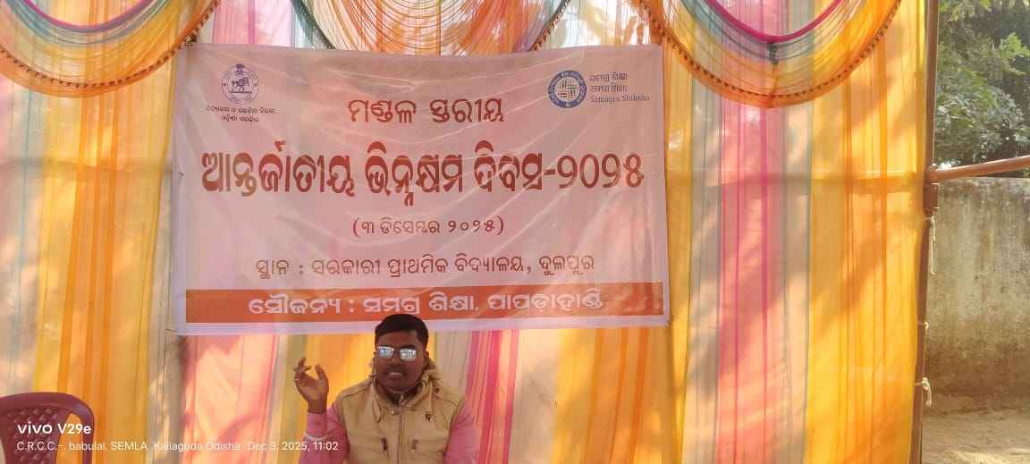 ସମଗ୍ର ଶିକ୍ଷା ଅନ୍ତର୍ଗତ ବ୍ଲକ୍ ସ୍ତରୀୟ ଆନ୍ତର୍ଜାତୀୟ ଦିବ୍ୟାଙ୍ଗ ଦିବସ ପାଳନ ପାପଡ଼ା ହାଣ୍ଡି ବ୍ଲକ ଦୁଲପୁର, ସରକାରୀ ପ୍ରାଥମିକ ବିଦ୍ୟାଳୟରେ ଦିବ୍ୟାଙ୍ଗ ଦିବସ ଉଦଯାପିତ ହୋଇଯାଇଛି । କାର୍ଯ୍ୟକ୍ରମର ପ୍ରମୁଖ ଉଦ୍ଦେଶ୍ୟ ଥିଲା— ଦିବ୍ୟାଙ୍ଗ ଶିଶୁମାନଙ୍କ ପ୍ରତି ସଚେତନତା, ସମାବେଶୀକରଣ ଏବଂ ସଶକ୍ତିକରଣକୁ ସୁଦୃଢ କରିବା।ଗୋଷ୍ଠୀ ଶିକ୍ଷା ଅଧିକାରୀ ସୁଦୀପ୍ତ ଦାସ କାର୍ଯ୍ୟକ୍ରମର ଶୁଭାରମ୍ଭ କରିଥିଲେ ।ବିଦ୍ୟାଳୟ ପ୍ରଧାନ ଶିକ୍ଷୟତ୍ରୀ, ଗୋଷ୍ଠୀ ସମ୍ବଳ ଶିକ୍ଷକ ସୁରଜ ଓ ସମାଜସେବୀ ମାନଙ୍କ ଉପସ୍ଥିତିରେ କାର୍ଯ୍ୟକ୍ରମ