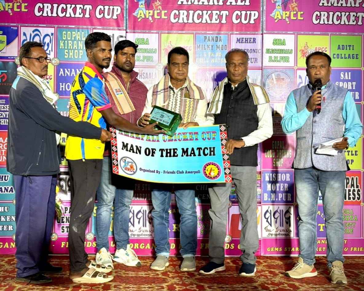 ବୀରମହାରାଜପୁର ,(ବିନୋଦ ପାଣ୍ଡେ):ସୁବର୍ଣ୍ଣପୁର ଜିଲ୍ଲା ବୀରମହାରାଜପୁର ବ୍ଲକ ଅନ୍ତର୍ଗତ ଅମରପାଲି ସ୍ଥିତ ଭଗବାନ ସାହୁ ଗ୍ରାଉଣ୍ଡ ରେ ଫ୍ରେଣ୍ଡସ କ୍ଲବ ଆନୁକୂଲ୍ୟରେ ହେଉଥିବା ୩୨ତମ ଅମରପାଲି କ୍ରିକେଟ କପ୍ ର ଶୁକ୍ରବାର ଥିଲା ତୃତୀୟ ଦିବସ। ଶୁକ୍ରବାର ପ୍ରଥମ ମ୍ୟାଚ୍ ଟି ବହଳପଦର ଓ ରଶିବେଡ଼ା ମଧ୍ୟରେ ହୋଇଥିଲା। ଏଥିରେ ବହଳପଦର ପ୍ରଥମେ ବ୍ୟାଟିଂ କରି ନିର୍ଦ୍ଧାରିତ ୧୦ ଓଭର ରେ ୪ ଉଇକେଟ ହରାଇ ୧୨୬ ରନ କରିଥିଲା। ଜବାବରେ ରଶିବେଡ଼ା ଦଳ ନିର୍ଦ୍ଧାରିତ ୧୦ ଓଭର ରେ ୭ ଉଇକେଟ ହରାଇ ୭୨ ରନ କରି ପରାସ୍ତ ହୋଇଥିଲା। ଏହି ମ୍ୟାଚ୍ ରେ ବହଳପଦର ର ବିକାଶ ଛତ୍ରୀ ଙ୍କୁ ମ୍ୟାନ ଅଫ ଦି ମ୍ୟାଚ୍ ଭାବେ ଘୋଷଣା କରାଯାଇଥିଲା। ସେହିପରି ଦ୍ବିତୀୟ ମ୍ୟାଚ୍ ଟି ଉଲୁଣ୍ଡା ଓ ଲୁତୁରପଙ୍କ ମଧ୍ୟରେ ହୋଇଥିଲା। ଏଥିରେ ଉଲୁଣ୍ଡା ପ୍ରଥମେ ବ୍ୟାଟିଂ କରି ନିର୍ଦ୍ଧାରିତ ୮ ଓଭର ରେ ୪ ଉଇକେଟ ହରାଇ ୧୧୫ ରନ କରିଥିଲା। ଜବାବରେ ଲୁତୁରପଙ୍କ ଦଳ ନିର୍ଦ୍ଧାରିତ ୮ ଓଭର ରେ ୩ ଉଇକେଟ ହରାଇ ୮୭ ରନ କରି ପରାସ୍ତ ହୋଇଥିଲା। ଏହି ମ୍ୟାଚ୍ ପାଇଁ ଉଲୁଣ୍ଡା ର ଅଭିଳାଷ ନାଏକ ଙ୍କୁ ମ୍ୟାନ ଅଫ ଦି ମ୍ୟାଚ୍ ଘୋଷଣା କରାଯାଇଥିଲା। ତୃତୀୟ ମ୍ୟାଚ୍ ଟି ପ୍ରଥମ ମ୍ୟାଚ୍ ର ବିଜେତା ବହଳପଦର ଓ ଦ୍ଵିତୀୟ ମ୍ୟାଚ୍ ର ବିଜେତା ଉଲୁଣ୍ଡା ମଧ୍ୟରେ ହୋଇଥିଲା। ଏଥିରେ ଉଲୁଣ୍ଡା ପ୍ରଥମେ ବ୍ୟାଟିଂ କରି ନିର୍ଦ୍ଧାରିତ ୧୦ ଓଭର ରେ ୭ ଉଇକେଟ ହରାଇ ୯୩ ରନ କରିଥିଲା। ଜବାବରେ ବହଳପଦର ଦଳ ଆବଶ୍ୟକୀୟ ୯୪ ରନ କୁ ନିର୍ଦ୍ଧାରିତ ୧୦ ଓଭର ର ଶେଷ ବଲ ରେ ୮ ଉଇକେଟ ହରାଇ ସଂଗ୍ରହ କରି ବିଜୟୀ ହୋଇ ସେମିଫାଇନାଲ ରେ ପ୍ରବେଶ କରିଛି। ପୀତାମ୍ବର ସାହୁ ଙ୍କ ସଂଯୋଜନା ରେ ଅନୁଷ୍ଠିତ ପୁରସ୍କାର ବିତରଣୀ ଉତ୍ସବରେ ବୀରମହାରାଜପୁର ବରିଷ୍ଠ ନାଗରିକ ସଂଗଠନ ର ସଭାପତି ଡ.ପ୍ରଫୁଲ୍ଲ କୁମାର ରଥ ମୁଖ୍ୟ ଅତିଥି , ସାଇ ଶିକ୍ଷା ନିକେତନ ର ସମ୍ପାଦକ ସରୋଜ କୁମାର ସାହୁ, ବିଶିଷ୍ଟ ବ୍ୟବସାୟୀ ଶ୍ୟାମ କୁମାର ସାହୁ ଓ ଅମରପାଲି ହାଇସ୍କୁଲର ଖେଳ ଶିକ୍ଷକ କହ୍ନେଇ ଚରଣ ପ୍ରଧାନ ପ୍ରମୁଖ ସମ୍ମାନିତ ଅତିଥିଭାବେ ଯୋଗଦେଇ ବହଳପଦର ର କୁନା ସାହୁ ଙ୍କୁ ମ୍ୟାନ ଅଫ ଦି ମ୍ୟାଚ୍ ଭାବେ ପୁରସ୍କୃତ କରିଥିଲେ