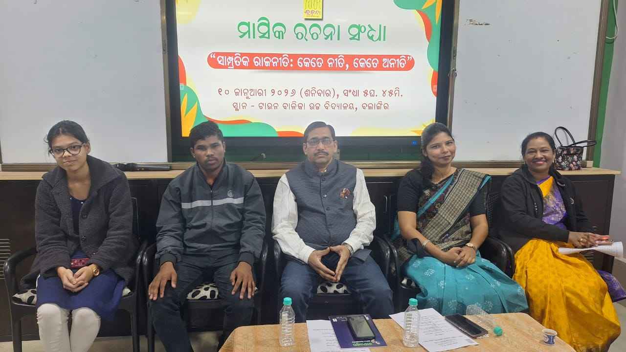 ସମାଜ, ସାହିତ୍ୟ ଓ ସଂସ୍କୃତି କ୍ଷେତ୍ରରେ କାର୍ଯ୍ୟରତ ବଲାଙ୍ଗୀରର ଅଗ୍ରଣୀ ଅନୁଷ୍ଠାନ 'ରଚନା'ର 'ମାସିକ ରଚନା ସନ୍ଧ୍ୟା'ରେ ଏହି ମତ ପ୍ରକାଶ ପାଇଛି। ସ୍ଥାନୀୟ ଟାଉନ ବାଳିକା ଉଚ୍ଚ ବିଦ୍ୟାଳୟ ସଭାକକ୍ଷରେ ଆୟୋଜିତ "ଆମ ରାଜନୀତି : କେତେ ନୀତି, କେତେ ଅନୀତି" ଶୀର୍ଷକ ଆଲୋଚନାଚକ୍ରରେ ପି.ଏସ. ଡିଗ୍ରୀ କଲେଜ, ଦେଓଗାଁର ଅଧ୍ୟାପକ ଡ. ସୁରେଶ ପ୍ରସାଦ ଷଡ଼ଙ୍ଗୀ, ବିଶ୍ବାତ୍ମ ବିଦ୍ୟାମନ୍ଦିରର ଶିକ୍ଷିକା ସ୍ପର୍ଶା ମିଶ୍ର, ରାଜେନ୍ଦ୍ର ବିଶ୍ୱବିଦ୍ୟାଳୟର ସ୍ନାତକ ଛାତ୍ର ସିଦ୍ଧାନ୍ତ ମହାକୁର ଓ ଛାତ୍ରୀ ପ୍ରତ୍ୟାଶା ମାହାଣା ଅତିଥିବକ୍ତା ଭାବରେ ଯୋଗ ଦେଇ ବିଶ୍ଳେଷଣାତ୍ମକ ବକ୍ତବ୍ୟ ରଖିଥିଲେ। କାର୍ଯ୍ୟକ୍ରମର ସଂଯୋଜନା କରିଥିଲେ 'ରଚନା'ର ସଦସ୍ୟା ସସ୍ମିତା ନେପାକ ଏବଂ ସମସ୍ତଙ୍କୁ ଧନ୍ୟବାଦ ଦେଇଥିଲେ ସହସମ୍ପାଦକ ରତ୍ନମୟ ତ୍ରିପାଠୀ। ଏହି କାର୍ଯ୍ୟକ୍ରମରେ ସହରର ଅନେକ ଆଇନଜୀବୀ, ଶିକ୍ଷକ, ଅଧ୍ୟାପକ, ସାହିତ୍ୟିକ, ସାମ୍ବାଦିକ, ବୁଦ୍ଧିଜୀବୀ ଓ ଛାତ୍ରଛାତ୍ରୀ ଯୋଗଦେଇ ଆଲୋଚନାରେ ଭାଗନେଇଥିଲେ।