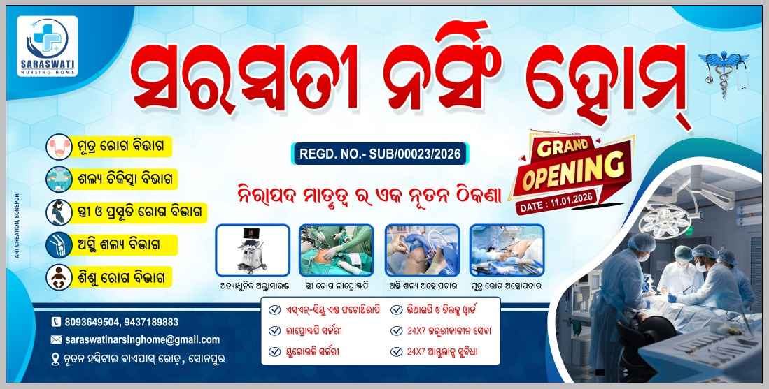 ସୁବର୍ଣ୍ଣପୁର ସହରରେ ସରସ୍ଵତୀ ନର୍ସିଂ ହୋମ ଉଦଘାଟିତ ହୋଇଯାଇଛି। ସୋନପୁର ର ନୂତନ ମୂଖ୍ୟ ଚିକିତ୍ସାଳୟ ପାଖ ବାଏ ପାସ୍ ରାସ୍ତାରେ ଶୁଭାରମ୍ଭ ହୋଇଥିବା ଏ କାର୍ଯ୍ୟକ୍ରମ ରେ ଗତକାଲି ପଞ୍ଚାୟତିରାଜ ଓ ପାନୀୟ ଜଳ ବିଭାଗର ଅତିରିକ୍ତ ସଚିବ ସୂର୍ଯ୍ୟନାରାୟଣ ଦାଶ ମୁଖ୍ୟ ଅତିଥି ଭାବେ ଯୋଗଦେଇ ନସିଂ ହୋମକୁ ଉଦ୍ଘାଟନ କରିଥିବା ବେଳେ ସମ୍ମାନିତ ଅତିଥି ଭାବରେ ପ୍ରଶାସନିକ ଅଧିକାରୀ ଯୁଗଳେଶ୍ୱରୀ ଦାଶ ଯୋଗ ଦେଇଥିଲେ l ପରେ ପରେ ଓଡ଼ିଶା ର ବିଶିଷ୍ଟ ୟୁରୋଲଜିଷ୍ଟ ଡାକ୍ତର ଦତ୍ତେଶ୍ୱର୍ ହୋତା ନର୍ସିଂ ହୋମ ପରିଦର୍ଶନ ରେ ଆସି ଆୟୋଜକ ଡାକ୍ତର ଓ ଉପସ୍ଥିତ ଜନ ସାଧାରଣ ଙ୍କୁ ଉତ୍ସାହିତ କରିଥିଲେ । ଉକ୍ତ ନର୍ସିଂ ହୋମ ରେ ୨୪ ଘଣ୍ଟିଆ ଜରୁରୀ କାଳୀନ ସେବା ସହ ଆମ୍ବୁଲାନ୍ସ ସେବା ଏବଂ ପ୍ରଥମ ପର୍ଯ୍ୟାୟ ରେ ମୂତ୍ର ରୋଗ ବିଭାଗ, ଶଲ୍ୟ ଚିକିତ୍ସା ବିଭାଗ, ସ୍ତ୍ରୀ ଓ ପ୍ରସୂତି ବିଭାଗ ଓ ଶିଶୁ ରୋଗ ବିଭାଗ ଖୋଲିଥିବା ବେଳେ ଅତ୍ୟାଧୁନିକ ଅଲଟ୍ରାସାଉଣ୍ଡ, ସ୍ତ୍ରୀ ରୋଗ ଲାପ୍ରୋସ୍କୋପି, ଅସ୍ଥିଶଲ୍ୟ ଅସ୍ତ୍ରୋପଚାର, ମୂତ୍ର ରୋଗ ଅସ୍ତ୍ରୋପଚାର, ଏସଏନ-ସିୟୁ ଆଣ୍ଡ ଫଟୋଥରାପି, ଲାପ୍ରୋସ୍କୋପି ସର୍ଜରୀ, ୟୁରୋଲଜି ସର୍ଜରୀ, ଭିଆଇପି ଡିଲକ୍ସ ୱାର୍ଡ଼ ଏ ସମସ୍ତ ସୁବିଧା ଉପଲବ୍ଧ ଥିବା ନସିଂ ହୋମର ଏମଡି ରିତୁ ଦାଶ କହିଛନ୍ତି ।