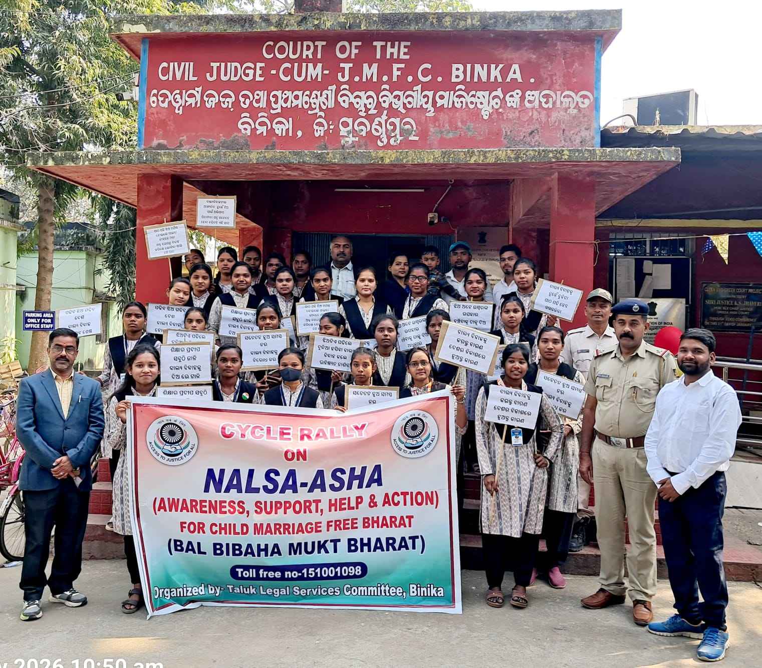 ବିନିକା(ହିମାଂଶୁ ଶେଖର ପୁଟେଲ)ବାଲ୍ୟ ବିବାହ ମୁକ୍ତ ଭାରତ ଗଠନ ନେଇ ବିନିକା ସହରରେ ସଚେତନତା ଶୋଭାଯାତ୍ରା ଅନୁଷ୍ଟିତ ହୋଇଯାଇଛି । ତାଲୁକ ଲିଗାଲ ସର୍ଭିସ କମିଟି ବିନିକା ତରଫରୁ ଅନୁଷ୍ଟିତ ଏହି ସଚେତନତା ଶୋଭାଯାତ୍ରାରେ ସିଦ୍ଧାର୍ଥ ଡିଗ୍ରୀ କଲେଜର ଛାତ୍ରଛାତ୍ରୀ ମାନେ ବିଭିନ୍ନ ପ୍ଳା କାର୍ଡ ଧରି ବାଲ୍ୟ ବିବାହ ମୁକ୍ତ ଭାରତ ଗଠନ ନେଇ ଲୋକଙ୍କୁ ସଚେତନତାର ବାର୍ତା ପ୍ରଦାନ କରିଥିଲେ।ଏହି କାର୍ଯ୍ୟକ୍ରମରେ ବିନିକା ଜେଏମଏଫସି ସୁପ୍ରଭା କୁଣ୍ଡୁ,ବାର ଆସୋସିଏସନର ସଭାପତି ସୁବାସ ନାୟକ,ବରିଷ୍ଟ ଆଇନଜୀବୀ ସୁଧାଂଶୁ ଶେଖର ଦାଶ, ତାକୁକ ଆଇନ ସେବା ସମ୍ପାଦକ ଚିତ୍ତରଞ୍ଜନ ପଣ୍ଡା,ସିଦ୍ଧାର୍ଥ ଡିଗ୍ରୀ କଲେଜ ଅଧ୍ୟାପକ ଭଗବାନ ସାହୁଙ୍କ ସମେତ ଓକିଲ ସଂଘ କର୍ମକର୍ତ୍ତା,ପୋଲିସ ଷ୍ଟାଫ,ଜେଏମଏଫସି କୋଟ କର୍ମଚାରୀ ଅଭିଷେକ,ବିନୟ,ରଜତ,ଜଗଦୀପ ପ୍ରମୁଖ ସାମିଲ ହୋଇଥିଲେ।
