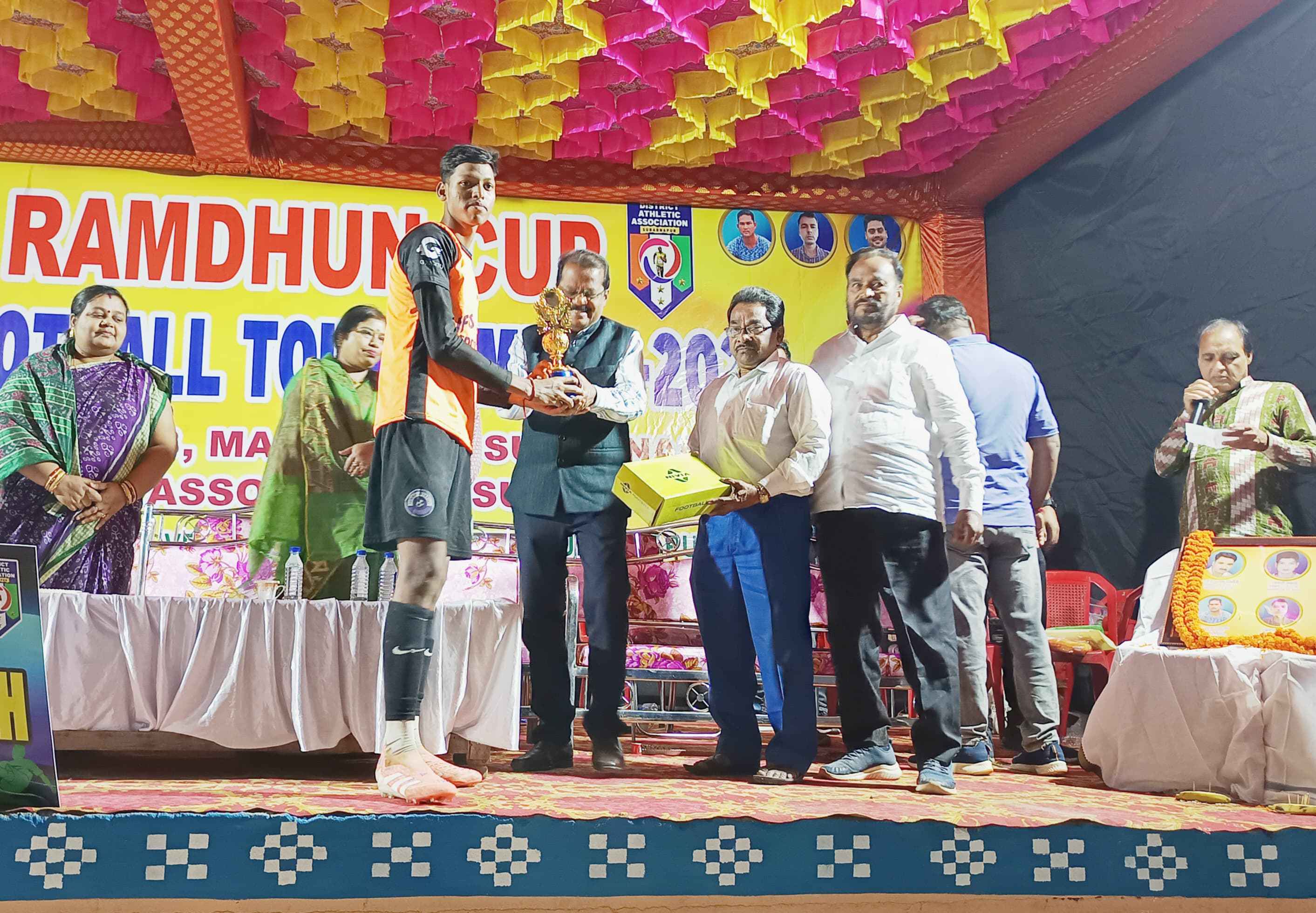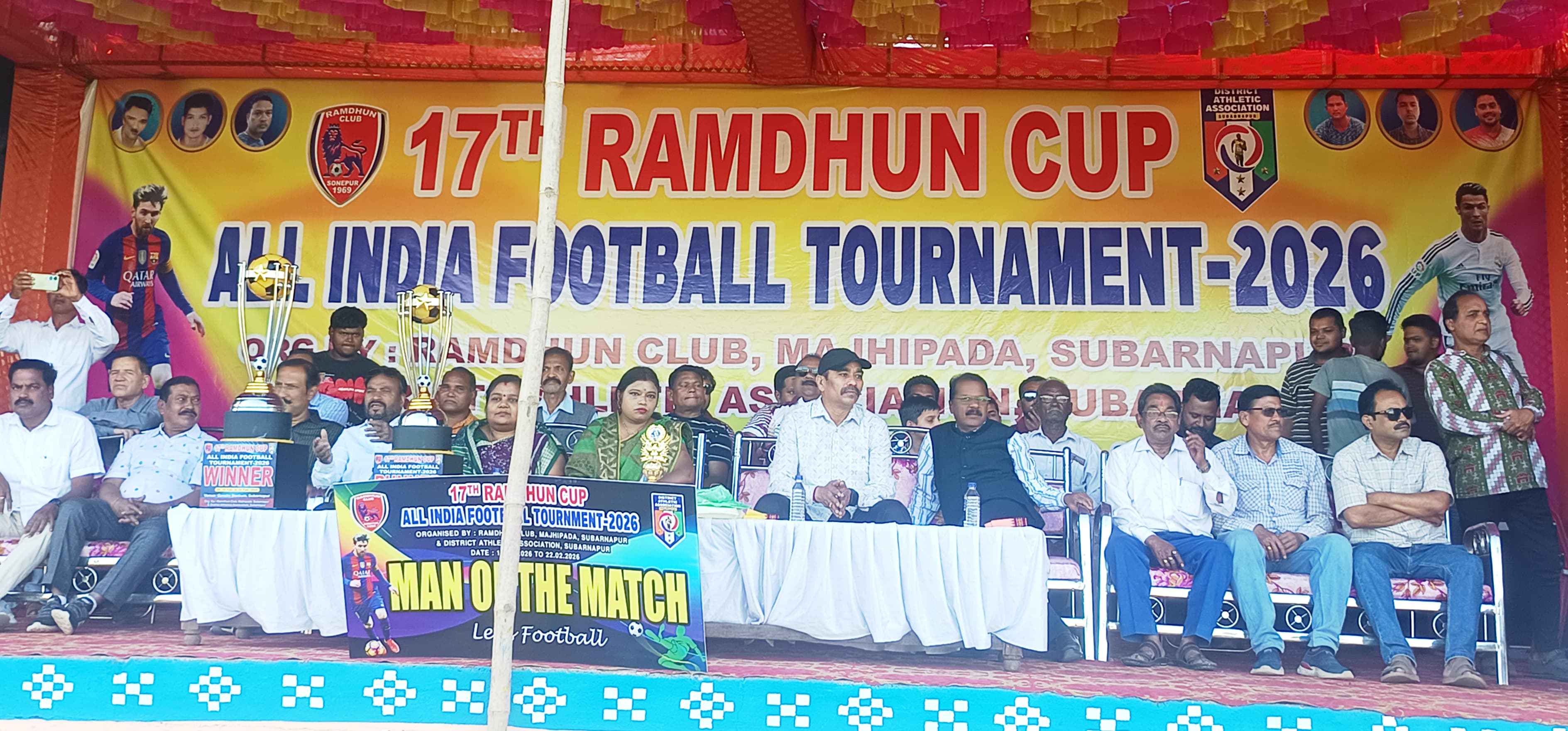 ସୋନପୁର ଗାନ୍ଧି ଷ୍ଟାଡିୟମ୍ ଠାରେ ୧୭ ତମ ସର୍ବ ଭାରତୀୟ ରାମ୍ ଧୂନ୍ କ୍ଲବ ଫୁଟବଲ ଟୁର୍ଣ୍ଣlମେଣ୍ଟ ଉଦ୍ଘାଟିତ ହୋଇ ଯାଇଛି l ଆଜି କନ୍ଧମାଳ ଏଫ୍ ସି ଦଳ ଓ କଲିକତା ବେଙ୍ଗଲି ଏକାଡେମୀ ଦଳ ମଧ୍ୟରେ ଆଜିର ଉଦଘାଟନୀ ମ୍ୟାଚ ଅନୁଷ୍ଟିତ ହୋଇଥିଲା l ସୁବର୍ଣ୍ଣପୁର ଜିଲ୍ଲାପାଳ ଡ଼. ନୃପ ରାଜ ସାହୁ ମୁଖ୍ୟ ଅତିଥି ଭାବେ, ସୁବର୍ଣ୍ଣପୁର ଏସପି ଶ୍ରୀ ନାରାୟଣ ନାଏକ ସମ୍ମାନିତ ଅତିଥି ଭାବେ ଯୋଗ ଦେଇ ଆୟୋଜକ ଙ୍କୁ ଭୂୟସୀ ପ୍ରଶଂସା କରି ଷ୍ଟାଡିୟମ୍ ବିକାଶ କାର୍ଯ୍ଯ କୁ ଶୀଘ୍ର ଆରଂଭ କରିବାକୁ ପ୍ରତିଶୁତି ଦେଇ ଥିଲେ l ଅନ୍ୟତମ ଅତିଥି ଭାବେ ପୌର ପରିଷଦ ଅଧ୍ୟକ୍ଷା ତାମସି ତାମସ୍ମିତା ନାଏକ, ଉପ ଅଧ୍ୟକ୍ଷା ମଲ୍ଲିକା ଦାନୀ, ସମାଜ ସେବୀ ଶ୍ରୀବତ୍ସ ମଲ୍ଲିକ, ପୌର ପରିଷଦ ପ୍ରାକ୍ତନ ଅଧ୍ୟକ୍ଷ କଇରୁ ସ୍ବାଇଁ, ଶ୍ରମିକ ନେତା ଗୋବିନ୍ଦ ମହାରଣା, କ୍ରିଡ଼ା ସଂଘ କାର୍ଯ୍ଯ କାରିଣୀ ସଦସ୍ୟ ଆଦିତ୍ୟ କିଶୋର ଦାନୀ, ଜିତେନ୍ଦ୍ର ସାହୁ , କଲିକତା ଦଳ ର ଫ୍ରାଞ୍ଚାଇଜ୍ ପ୍ଲାବନ ମହାପାତ୍ର, କନ୍ଧମାଳ ଦଳ ର ଫ୍ରାଞ୍ଚାଇଜ୍ ନିଶାନ୍ତ ମହାନ୍ତି ଯୋଗ ଦେଇ ଖେଳାଳୀ ଆୟୋଜକ ଙ୍କୁ ଉତ୍ସାହିତ କରିଥିଲେ l ଆଜିର ଖେଳ କୁ ମୁଖ୍ୟ ରେଫରି ଭାବେ ସଞ୍ଜୀବ ସାହୁ , ସହଯୋଗୀ ରେଫରୀ ଭାବେ ଜିତୁ ପାତ୍ର, ସଂଜନ ସାହୁ, ଭୁକୁଲୁ ବକ୍ସି, ବିଦ୍ୟାଧର ମିଶ୍ର, ଓ ଫୋର୍ଥ ରେଫରି ଭାବେ ସୁଶାନ୍ତ ବାଗ ସହଯୋଗ୍ କରି ଥିଲେ l ଅତିଥି ଓ ଭେଟରାନ କ୍ରିଡ଼ାବିଡ ମାନଙ୍କ ସହିତ ହଜାର ଦର୍ଶକ ଖେଳ କୁ ଉପଭୋଗ କରିଥିବା ବେଳେ ମନୋରଞ୍ଜନ ତ୍ରିପାଠୀ ସଭା ପରିଚାଳନା କରିଥିଲେ l ଖେଳ ର ଶେଷ ଯାଏ ଉଭୟ ଦଳ ୧-୧ ଗୋଲ୍ ସ୍କୋର କରି ଆଜିର ଖେଳ ବରାବର କରିଥିଲେ l ଟ୍ରାଏ ବ୍ରେକର ରେ କଲିକତା ଦଳ ୩-୨ ଗୋଲ୍ ରେ ବିଜୟୀ ହୋଇ ଥିଲେ l କ୍ରୀଡ଼ା ସଂଘ ସଂପାଦକ ପୀୟୂଷ ପଣ୍ଡା, ରମଧୁନ କ୍ଳବ୍ ସଦସ୍ୟ ବିକାଶ ପଣ୍ଡା, ଲଡୁ କିଶୋର ମଲ୍ଲିକ, ସନ୍ତୋଷ ପାଢ଼ୀ, ବୁବୁନ ନାଏକ, ବାଲ ଗୋପାଲ ମିଶ୍ର, ପ୍ରିତମ ସରାଫ, ରିକୁନ ପନାଏକ, ଚନ୍ଦନ ବେହେରା, ଆୟୁଷ ପଣ୍ଡା, ଅଂଶୁମାନ ପଣ୍ଡା ଙ୍କ ସମେତ ସମସ୍ତ ସଦସ୍ୟ ସହଯୋଗ କରିଥିଲେ l କଲିକତା ଦଳ ର ସୁବାଷ ବେରା ଙ୍କୁ ଆଜିର ଖେଳ ରେ ମ୍ୟାନ ଅଫ ଦି ମ୍ୟାଚ ଭାବେ ଜିଲ୍ଲାପାଳ ଙ୍କ ଦ୍ବାରା ପୁରସ୍କୃତ କରା ଯାଇଥିଲା l ପ୍ରଭୁ ଦାସ କୁମ୍ଭାର ଖେଳ ର ପ୍ରତ୍ୟକ୍ଷ ଧାରା ବିବରଣୀ ପ୍ରଦାନ କରିଥିଲେ l ଦର୍ଶକ ଙ୍କ ପାଇଁ ଆୟୋଜିତ ଲଟେରୀ ରେ ନେତ୍ର ପଧାନ ପ୍ରଥମ ପୁରସ୍କାର ମୋବାଇଲ ଫୋନ୍, ଡି ଏଲ୍ ସି ଶ୍ରୀ ଡିଲେଶ୍ୱର ଖାକା ଦ୍ୱିତୀୟ ପୁରସ୍କାର ୟର୍ କୋଡ, କୃପା ନିଧି ଙ୍କୁ ତୃତୀୟ ପୁରସ୍କାର ଟି ସର୍ଟ ଜର୍ସି ପ୍ରଦାନ କରା ଯାଇଥିଲା l