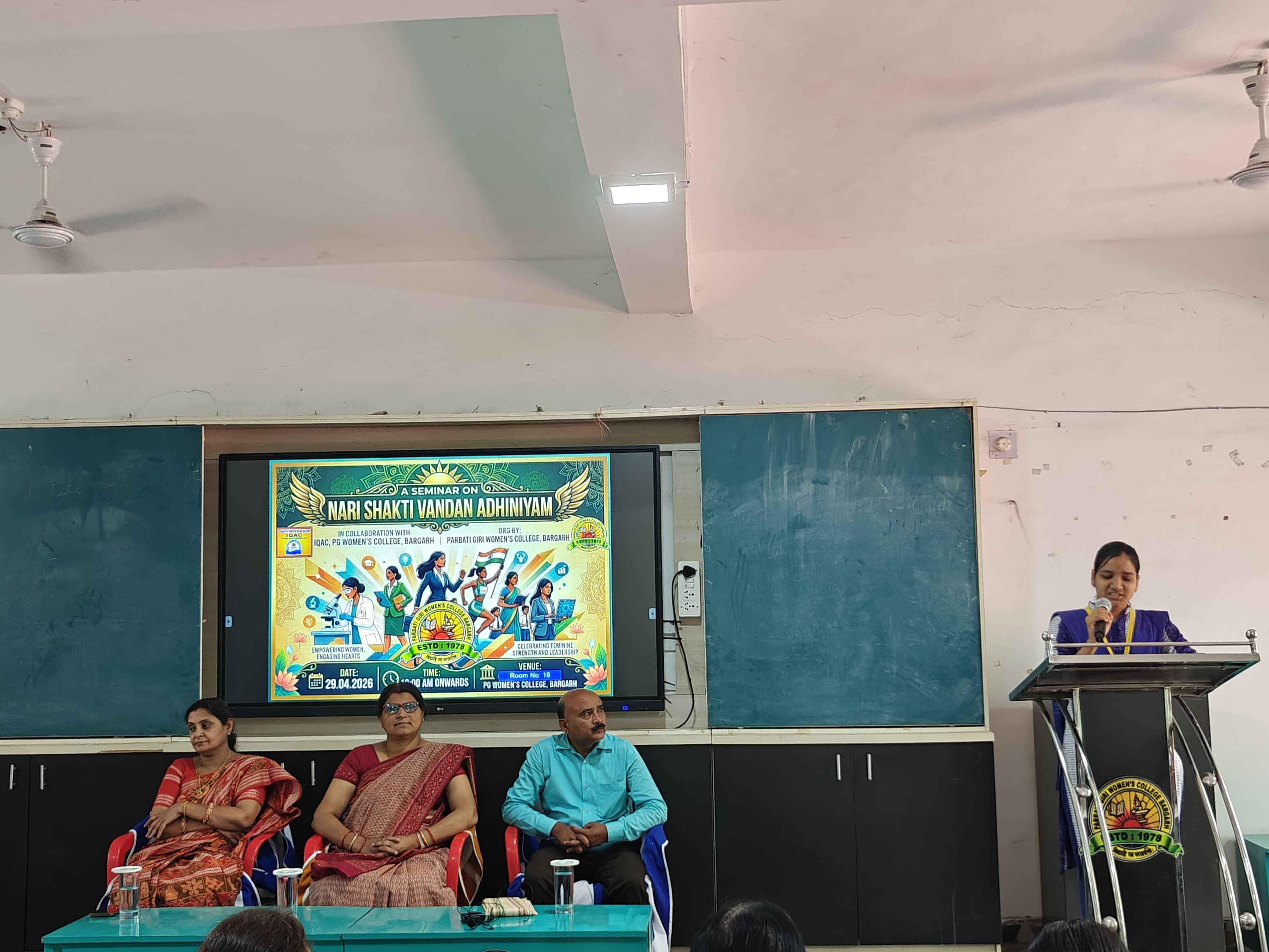 ସହକାରୀ ପ୍ରଫେସର ଶ୍ରୀଯୁକ୍ତ ସୁବଳ ମେହେର ମୁଖ୍ଯ ଆଲୋଚକ ଭାବେ ଯୋଗଦେଇ ଭାରତୀୟ ଲୋକତନ୍ତ୍ରରେ ମହିଳାମାନଙ୍କ ଭାଗୀଦାରିତା ଓ ନାରୀଶକ୍ତି ବନ୍ଦନ ଅଧିନିୟମ ର ପ୍ରାସଙ୍ଗିକତା ସଂପର୍କରେ ବିଶଦ ଆଲୋଚନା କରିଥିଲେ। ମହାବିଦ୍ୟାଳୟର ରାଜନୀତି ବିଜ୍ଞାନର ଚତୁର୍ଥ ସେମିଷ୍ଟାର୍ ର ଛାତ୍ରୀ ଜ୍ଯୋତିର୍ମୟୀ ମ୍ରିଶ୍ର ନିଜର ସନ୍ଦର୍ଭ ଉପସ୍ଥାପନ କରିଥିଲେ । ଏହି କାର୍ଯ୍ୟକ୍ରମରେ ମହାବିଦ୍ୟାଳୟ ର ଅନେକ ଅଧ୍ଯାପକ, ଅଧ୍ଯାପିକା, କର୍ମଚାରୀବୃନ୍ଦ ଓ ବିଭିନ୍ନ ବିଭାଗର ଛାତ୍ରୀ ମାନେ ଯୋଗଦେଇ ଥିଲେ । ସଭା ଶେଷରେ ପ୍ରାଧ୍ୟାପିକା ମଧୁସ୍ମିତା ନନ୍ଦ ଧନ୍ୟବାଦ ଅର୍ପଣ କରିଥିଲେ ।