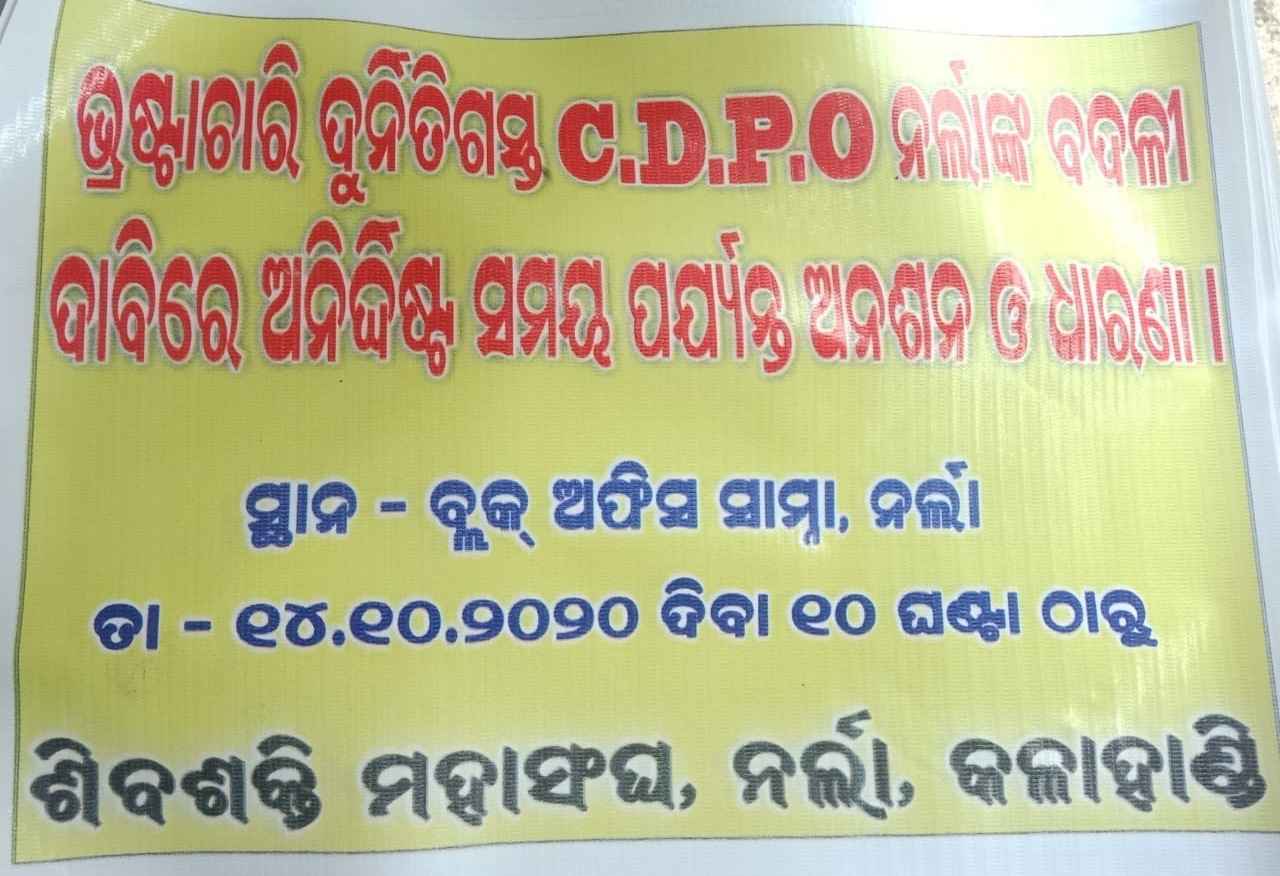 କଳାହାଣ୍ଡି (ସଞ୍ଜୀବ ଦାସ ) କଲାହାଣ୍ଡି ଜିଲ୍ଲା ନର୍ଲା ବ୍ଳକ ର କାର୍ଯ୍ୟରତ ଆଇସିଡିଏସ ର ସିଡିପିଓ ଙ୍କ ମନମୁଖୀ କାର୍ଯ୍ୟ ଓ ବେଆଇନ କାମ କରୁଥିବା ଅଭିଯୋଗ ନେଇ ସ୍ଥାନୀୟ ଶିବ ଶକ୍ତି ମହାସଂଘ ଓ ସେବାକାରି କିନ୍ନର ମହାସଂଘ ପକ୍ଷରୁ ବ୍ଲକ୍ କାର୍ଯ୍ୟାଳୟ ସମ୍ମୁଖରେ ସିଡିପିଓ ଙ୍କ ବଦଳି ଦାବିରେ ଅନିର୍ଦ୍ଧିଷ୍ଟ କାଳ ପାଇଁ ଅନଶନ ଓ ଧାରଣା ରେ ଦିଆଯାଇଛି। ପ୍ରଥମେ ସଂଘ ପକ୍ଷରୁ ଏକ ଶୋଭାଯାତ୍ରା ରେ ବାହାରି ସହର ପରିକ୍ରମା କରି ବ୍ଳକ କାର୍ଯ୍ୟାଳୟ ସମ୍ମୁଖରେ ପହଞ୍ଚିଥିଲେ।ଏଠାରେ କାର୍ଯ୍ୟରତ ସିଡିପିଓ ଦୀର୍ଘ ୭ ବର୍ଷ ରୁ ଉର୍ଦ୍ଧ ଦିନ ଗୋଟିଏ ସ୍ଥାନରେ ରହିବା ନିୟମ ନ ଥିବା ବେଳେ ସେ ଗୋଟିଏ ସ୍ଥାନରେ ରହିଆସିଛନ୍ତି। ତେଣୁ ସେ ମନମୁଖୀ କାର୍ଯ୍ୟ କରୁଥିବାରୁ ବିଭିନ୍ନ ମହଲରେ ଅସନ୍ତୋଷ ଦେଖାଦେଇଛି।ତା ସହିତ ନିମ୍ନମାନର ଛତୁଆ ପ୍ରସ୍ତୁତି ଓ ନିଜ ମନ ମୁତାବକ ବିନା ସୂଚନା ରେ ସଂଘ ପରିବର୍ତ୍ତନ କରିବା ରେ ସିଡିପିଓ ଙ୍କ ହାତ ଥିବା ମଧ୍ୟ ଅଭିଯୋଗ ହେବା ସହ ଅସନ୍ତୋଷ ବଢିବାରେ ଲାଗିଛି। ତେଣୁ ସଡିପିଓ ଙ୍କୁ ତୁରନ୍ତ ବଦଳି ଦାବି ହେଉଛ।