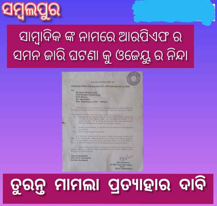ସମ୍ବଲପୁର,ସଂଜୀବପାଣିଗ୍ରାହୀଙ୍କରିପୋର୍ଟ): ସମ୍ବଲପୁର ଜ଼ିଲ୍ଲା ବାମରା ବ୍ଲକର ବରିଷ୍ଠ ସାମ୍ବାଦିକ ଜ୍ୟୋତି କୁମାର ଲାଠ ଙ୍କ ନାମରେ ଝାରସୁଗୁଡ଼ା ଆର୍ପିଏଫ ପକ୍ଷରୁ ସମନ ଜାରି କରାଯିବା ଘଟଣା କୁ ସାମ୍ବାଦିକ ସଂଘ ଗୁଡ଼ିକ ପକ୍ଷରୁ ଦୃଢ ନିନ୍ଦା କରାଯାଇଛି । ଓଡିଶା ସାମ୍ବାଦିକ ସଂଘ (ଓଜେୟୁ) ସମ୍ବଲପୁର ଜ଼ିଲ୍ଲା ଶାଖା ପକ୍ଷରୁ ସାମ୍ବାଦିକ ଶ୍ରୀ ଲାଠ ଙ୍କ ନାମରେ ଆର୍ପିଏଫ ପକ୍ଷରୁ ସମନ ଜାରି ଘଟଣା କୁ ଦୃଢ ନିନ୍ଦା କରାଯିବା ସହିତ ତୁରନ୍ତ କେସ୍ ପ୍ରତ୍ୟାହାର ପାଇଁ ଦାବି ହୋଇଛି I ଏଠାରେ ସୂଚନା ଯୋଗ୍ୟ ଯେ ସମ୍ବଲପୁର ଜ଼ିଲ୍ଲା ବାମରା କ୍ରିୟାନୁଷ୍ଠାନ କମିଟିର ଆହ୍ୱାନ କ୍ରମେ ଗତ ଡିସେମ୍ବର ୧୫ ତାରିଖ ରେ ବାମରା ରେଳ ଷ୍ଟେସନ ଠାରେ ରେଳରୋକୋ କରାଯାଇଥିଲା I ଏଥିରେ କମିଟିର ସଦସ୍ୟଙ୍କ ସମେତ ଶତାଧିକ ଗ୍ରାମବାସୀ ଅଂଶଗ୍ରହଣ କରିଥିଲେ I ଏହି ପରିପ୍ରେକ୍ଷୀରେ ବିଭିନ୍ନ ଗଣମାଧ୍ୟମର ପ୍ରତିନିଧି ଓ ସାମ୍ବାଦିକ ଖବର ସଂଗ୍ରହ କରିଥିଲେ I ସେମାନଙ୍କ ମଧରେ ବାମରା ବ୍ଲକର ବରିଷ୍ଠ ସାମ୍ବାଦିକ ଜ୍ୟୋତି କୁମାର ଲାଠ ମଧ୍ୟ ଉପସ୍ଥିତ ଥିଲେ I ଆନ୍ଦୋଳନ ରତ ସଂଗ୍ରାମୀଙ୍କ ସହ ରେଲୱେର ଉଚ୍ଚ ଅଧିକାରୀ, ଆର୍ପିଏଫ, ଜିଆର୍ପି, ସ୍ଥାନୀୟ ପୋଲିସ, ପ୍ରଶାସନିକ ଅଧିକାରୀ ଉପସ୍ଥିତ ରହି ଲିଖିତ ପ୍ରତିଶ୍ରୁତି ଦେବା ପରେ ଆନ୍ଦୋଳନକୁ ସ୍ଥଗିତ ରଖାଯାଇଥିଲା। ଏଥିରେ କାହାରି ନାମରେ କୌଣସି ମାମଲା ରୁଜ୍ଜୁ କରାଯିବ ନାହିଁ ବୋଲି ପ୍ରତିଶ୍ରୁତି ଦିଆଯାଇଥିଲା। ମାତ୍ର ପରବର୍ତ୍ତୀ ସମୟରେ ଆନ୍ଦୋଳନକାରୀ ଙ୍କ ନାମରେ ଆର୍ପିଏଫ୍ ପକ୍ଷରୁ ଗୋଟେ ପରେ ଗୋଟିଏ ସମନ ଜାରି କରାଯାଇଥିଲା। ଏହା ସହିତ ସାମ୍ବାଦିକ ଶ୍ରୀ ଲାଠ ଙ୍କ ନାମ ରେ ମଧ୍ୟ ସମନ ଜାରି କରାଯାଇଥିବା ଜଣାପଡ଼ିଛି। ଆଗାମୀ ୨୩ ତାରିଖରେ ଝାରସୁଗୁଡ଼ା ଆର୍ପିଏଫ୍ ଥାନାରେ ଉପସ୍ଥିତ ରହି ପକ୍ଷ ରଖିବାକୁ ସମନ ରେ ଉଲ୍ଲେଖ ରହିଛି I