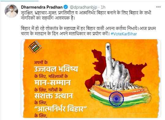 ବିହାରରେ ଆଜି ପ୍ରଥମ ପର୍ଯ୍ୟାୟ ନିର୍ବାଚନ: ବିହାରବାସୀଙ୍କୁ କେନ୍ଦ୍ରମନ୍ତ୍ରୀ ଧର୍ମେନ୍ଦ୍ର ପ୍ରଧାନଙ୍କ ଅନୁରୋଧ । ମତଦାନ କରି ବିହାରବାସୀ ନିଜର କର୍ତ୍ତବ୍ୟ ପାଳନ କରନ୍ତୁ । ସୁରକ୍ଷିତ, ଦୁର୍ନୀତି ମୁକ୍ତ, ପ୍ରଗତିଶୀଳ ଓ ଆତ୍ମନିର୍ଭର ବିହାର ଗଠନ ପାଇଁ ସମସ୍ତଙ୍କ ସହଯୋଗ ଆବଶ୍ୟକ: ଧର୍ମେନ୍ଦ୍ର ପ୍ରଧାନ!!*