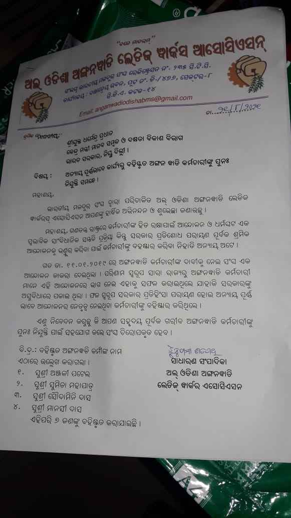 ସେହି କାରଣରୁ କେତେଜଣ ଭଉଣୀ ମୁକ୍ଷ ଭୂମିକାରେ କାଜ୍ୟ କରିଥିବାରୁ ତାଙ୍କୁ ସରକାର ନିଲମ୍ବିତ କରିଛନ୍ତି ସେମାନେ ହେଲେ ସୁଶ୍ରୀ ଅଞ୍ଜଳୀ ପଟେଲ,ସୁମିତ୍ରା ମହାପାତ୍ର , ସୌଦାମିନୀ ଦାସ ମାନସୀ ଦାସ, ଏପରି ୭ ଜଣ ଅଙ୍ଗନୱାଡ଼ି କର୍ମୀ ଚାକିରି ରୁ ବାହାର କରି ଦିଆଯାଇଛି ଏଣୁ ମାନ୍ୟବରପ୍ରଧାମନ୍ତ୍ରୀ ନରେନ୍ଦ୍ର ମୋଦୀ ଓ ମାନବ ସମ୍ବଳ କେନ୍ଦ୍ର ମନ୍ତ୍ରୀ ଧର୍ମେନ୍ଦ୍ର ପ୍ରଧାନ ଙ୍କୁ ଏହି ଦାବୀ ପତ୍ର ମାଧ୍ୟମରେ ସେହି ସାତଜଣ ଅଙ୍ଗନବାଡ଼ି ଭଉଣୀ ମାନଙ୍କୁ ନିଜ ନିଜ ଅଙ୍ଗନୱାଡ଼ି କେନ୍ଦ୍ର ରେ ନିଯୁକ୍ତି ଦେବା ପାଇଁ ନିବେଦନ କରିଛନ୍ତି l