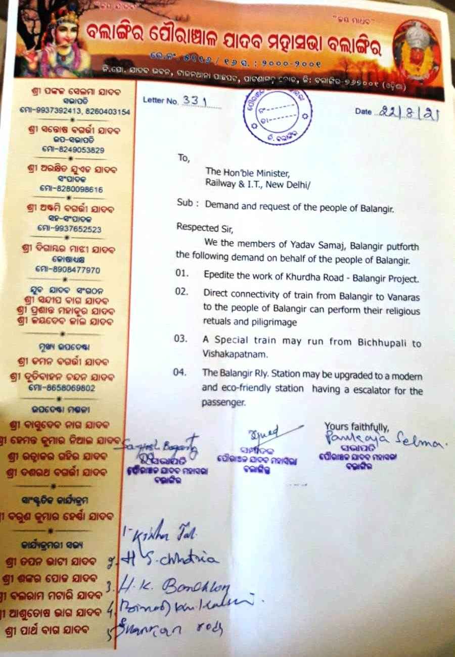 ପ୍ରଦାନ କରିଥିଲେ । ବଲାଙ୍ଗିର-ଖୋର୍ଦ୍ଧା ରୋଡ ରେଳପଥକୁ ଶିଘ୍ର ସମାପ୍ତ କରିବା, ବଲାଙ୍ଗିର - ପ୍ରୟାଗରାଜ ବନାରସକୁ ଟ୍ରେନ ଚଳାଇବା, ଏକ ସ୍ୱତନ୍ତ୍ର ଟ୍ରେନ ବିଛୁପାଲି ରୁ ବିଶାଖାପାଟଣାମ୍ ପର୍ଯ୍ୟନ୍ତ ଚଳାଇବା, ବଲାଙ୍ଗିର ରେଳ ଷ୍ଟେସନକୁ ଆଧୁନିକ କରଣ ଓ ଏକୋ ଫ୍ରେଣ୍ଡଲି ଷ୍ଟେସନ ଇତ୍ୟାଦି ପ୍ରସ୍ତାବ ଦାବିପତ୍ରରେ ସୂଚିତ କରାଯାଇଛି ।