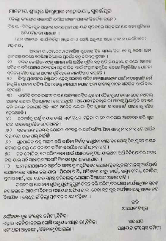 ବିନିକା:(ହିମାଂଶୁ ଶେଖର ପୁଟେଲ)- ୮ପ୍ରମୁଖ ଦାବିନେଇ ଆସନ୍ତାକାଲି ଗୁରୁବାର ବିନିକା କଂଗ୍ରେସ ତରଫରୁ ବିନିକା ବ୍ଲକ ଅଧିନସ୍ଥ ସମସ୍ତ ୧୬ଗୋଟି ପଞ୍ଚାୟତ ସମ୍ଭୁଖରେ ବିକ୍ଷୋଭ ପ୍ରଦର୍ଶନ କରାଯିବ ବୋଲି ବିନିକା ବ୍ଲକ କଂଗ୍ରେସ କମିଟି ସଭାପତି ରବୀନ୍ଦ୍ର କୁମାର ହୋତା ସୂଚନା ଦେଇଛନ୍ତି l ସୁବର୍ଣ୍ଣପୁର ଜିଲ୍ଲା କଂଗ୍ରେସ ସଭାପତି ଗୌରୀ ଶ୍ୟାମ ପଣ୍ଡାଙ୍କ ନିର୍ଦ୍ଦେଶ କ୍ରମେ ଅନୁଷ୍ଟିତ ଏହି ବିକ୍ଷୋଭ ପ୍ରଦର୍ଶନ ସକାଳ ୧୧ଘଣ୍ଟାରୁ ୧ଘଣ୍ଟା ପର୍ଯ୍ୟନ୍ତ କଂଗ୍ରେସ କର୍ମୀ ମାନଙ୍କ ଦ୍ଵାରା କରାଯିବା ପରେ ସ୍ଥାନୀୟ ପଞ୍ଚାୟତର କାର୍ଯ୍ୟନିର୍ବାହୀ ଅଧିକାରୀ ଓ ବିଡ଼ିଓଙ୍କ ମଧ୍ୟ ବର୍ତିତାରେ ଦାବିପତ୍ର ସୁବର୍ଣ୍ଣପୁର ଜିଲ୍ଲାପାଳଙ୍କୁ ପ୍ରଦାନ କରାଯିବ l ସୂଚନା ଯୋଗ୍ୟଯେ, ଚଳିତ କୋଭି ଡ-୧୯କୁ ସାମନା କରି ଅନେକ ପରିବାରଙ୍କ ଆର୍ଥିକ ସ୍ଥିତି ଦୟନୀୟ ହୋଇପଡ଼ିଥିବା ବେଳେ ସରକାରୀ ଯୋଜନା ସେମାନଙ୍କ ପାଇଁ ସାତ ସପନ ପାଲଟିଛି, ମନରେଗା ଯୋଜନା ଗରିବ ଦିନ ମଜୁରିଆ ଙ୍କ ପାଇଁ ଉଦ୍ଦିଷ୍ଟ ଥିବା ବେଳେ ଜିଲ୍ଲା ପ୍ରଶାସନ ର ନିଷ୍କ୍ରିୟତା ଯୋଗୁଁ ତାହା ଠିକ ଭାବରେ କାର୍ଯ୍ୟକାରୀ ହେଉ ନ ଥିବାରୁ ଲୋକେ ବାଧ୍ୟ ହୋଇ ଅନ୍ୟ ରାଜ୍ୟକୁ ଦାଦନ ଖଟିବାକୁ ଯାଉଛନ୍ତି,ସରକାରଙ୍କ ଆବାସ ଯୋଜନା ସ ଠିକ ଭାବେ ଚୟନ ହେଉ ନ ଥିବାରୁ ଯୋଗ୍ୟ ହିତାଧିକାରୀ ଏଥିରୁ ବାଦ ପଡୁଥିବା ଓ ଅଯୋଗ୍ୟ ହିତାଧିକାରୀଙ୍କୁ ପ୍ରୀୟପ୍ରିତି ପୋଷଣ କରି ଆବାସ ଘର ଯୋଗାଇ ଦିଆଯାଇଛି, ପ୍ରକୃତ ହିତାଧିକାରୀଙ୍କୁ ରାସନ କାର୍ଡରୁ ବଞ୍ଚିତ କରାଯାଉଛି ଯତ ଫଳରେ ସେମାନେ ଚଡା ଦରରେ ଚାଉଳ,କିରୋସିନ, ଗହମ କିଣି ଶୋଷଣର ଶିକାର ହେଉଛନ୍ତି,୬୦ବର୍ଷରୁ ଉର୍ଦ୍ଧ୍ବ ବ୍ୟକ୍ତି ଓ ବିଧବା ମହିଳା ମାନେ ଭତ୍ତା ପାଇଁ ବାରମ୍ବାର ଆବେଦନ କରି ନିରାଶ ହେଉଥିଲେ ମଧ୍ୟ ସେମାନଙ୍କ ପ୍ରତି ପ୍ରଶାସନର ଆନ୍ତରିକତା ନାହିଁ,ଯାହା ଫଳରେ ଭତ୍ତା ଟଙ୍କା ପାଇବାରୁ ଅନେକ ବୃଦ୍ଧ ବୃଦ୍ଧା ବଞ୍ଚିତ ହେଉଛନ୍ତି,ସରକାରଙ୍କ ହରିଶ୍ଚନ୍ଦ୍ର ଯୋଜନା ଶବ ସତ୍କାର ପାଇଁ ଉଦ୍ଦିଷ୍ଟ ଥିବା ବେଳେ ତାହା ମାସ ମାସ ଧରି ମିଲୁ ନ ଥିବାରୁ ଶୋକ ସନ୍ତପ ପରିବାର ଠିକ ସମୟରେ ସହା ୟତାରୁ ବଞ୍ଚିତ ହେଉଛନ୍ତି,ଗୃହ ପାଳିତ ପଶୁ ପାଳନ କରି ଜୀବିକା ନିର୍ବାହ କରୁଥିବା ବ୍ୟକ୍ତି ବିଶେଷଙ୍କୁ ଠିକ ଭାବରେ ଚୟନ କରି ଉକ୍ତ ଯୋଜନାରେ ସାମିଲ କରାଯାଉ, କୋଭି ଡ -୧୯ପରିଚାଳନା ପାଇଁ ପଞ୍ଚାୟତ କୁ ଦିଆଯାଇଥିବା ଅର୍ଥ ବିନିଯୋଗର ତଦନ୍ତ କରାଯାଇ ସର୍ବସାଧାରଣରେ ଅବଗତ କରାଯାଉ,ଗ୍ରାମ ପଞ୍ଚାୟତ ଅଧୀନ ସମସ୍ତ ଗ୍ରାମରେ ଥିବା ଯୋଗ୍ୟ ହିତାଧିକାରୀଙ୍କୁ ଅନ୍ନପୂର୍ଣ୍ଣା ଯୋଜନାରେ ସାମିଲ କରାଯାଉ,ସମସ୍ତଙ୍କୁ ପିଇବା ପାଣି,ପରିବେଶ ସ୍ବାସ୍ଥ୍ୟ କାର୍ଡ,ସ୍ୱାସ୍ଥ୍ୟବୀମା, କୋଭି ଡ ପ୍ରମାଣ ପତ୍ର ଆଦି ସମସ୍ତଙ୍କୁ ଯୋଗାଇ ଦେବାକୁ କଂଗ୍ରେସ ଦଳ ତରଫରୁ ଦାବି କରାଯାଇଛି l ତେବେ ଉପରୋକ୍ତ ସମୂହ ଦାବିପ୍ରତି ପଦକ୍ଷେପ ନିଆ ନ ଗଲେ ଆଗାମୀ ଦିନରେ ପଞ୍ଚାୟତ କାର୍ଯ୍ୟାଳୟକୁ ତାଲା ପକାଇ ଦିଆଯିବ ଓ ବ୍ଲକ ଅଫିସକୁ ସମ୍ପୂର୍ଣ୍ଣ ଭାବେ ଅଚଳ କରିଦିଆଯିବ ବୋଲି ଦାବିପତ୍ରରେ ଉଲ୍ଲେଖ କରାଯାଇଛି l