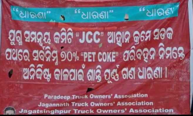 ଜଗତସିଂହପୁର(ନୃସିଂହ ବାରିକ) :-ଭାରତୀୟ ତୈଳ ନିଗମର ପାରାଦ୍ବୀପ ତୈଳ ବିଶୋଧନାଗାର ପ୍ରକଳ୍ପ ଟ୍ରକ ପରିବହନ ବନ୍ଦ କରିଥିବାରୁ ଟ୍ରକ ମାଲିକମାନେ ଆର୍ଥିକ ଅନାଟନ ମଧ୍ୟରେ ଦିନ କାଟୁଛନ୍ତି । ପୁନଶ୍ଚ ଟ୍ରକ ପରିବହନ ଚାଲୁ ରଖିବା ପାଇଁ କମ୍ପାନୀକୁ ଲିଖିତ ଅନୁରୋଧ କରିଥିଲେ । ମାତ୍ର କମ୍ପାନୀ ଏହାକୁ ଗୁରୁତ୍ୱ ନଦେବାରୁ ପାରାଦ୍ବୀପ ଟ୍ରକ ମାଲିକ ସଂଘ, ଜଗନ୍ନାଥ ଟ୍ରକ ମାଲିକ ସଂଘ ଏବଂ ଜଗତସିଂପୁର ଟ୍ରକ ମାଲିକ ସଂଘ ମିଳିତ ଭାବେ ପ୍ରତିବାଦ ସ୍ବରୂପ ମଙ୍ଗଳବାରଠାରୁ ଧାରଣାରେ ବସି ରହିଛନ୍ତି । ସୂଚନା ଯୋଗ୍ୟ ଆଇଓସିଏଲ କମ୍ପାନୀ ଯେବେଠୁ ପେଟ୍ରୋ କୋକ୍ ଉତ୍ପାଦନ ଆରମ୍ଭ କଲା ଦୈନିକ ୩୦୦ ରୁ ୪୦୦ ଟ୍ରକ ରୋଡ ପରିବହନ ପାଇଁ