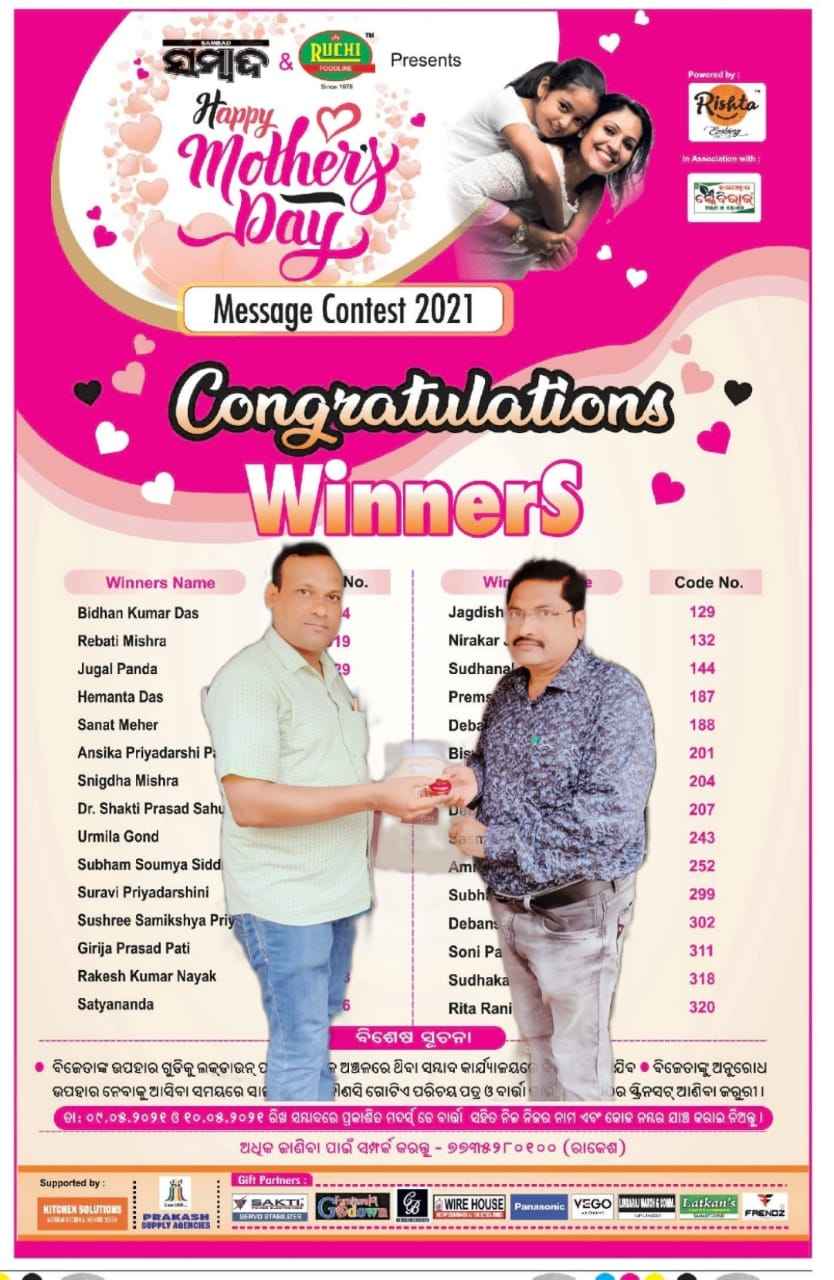 ତୁଷୁରା(ପ୍ରେରଣା ଖବର) : ଦୈନିକ ଖବର କାଗଜ ସମ୍ବାଦ ପକ୍ଷରୁ ଆୟୋଜିତ "ମାତୃ ଦିବସ" ସନ୍ଦେଶ ପ୍ରତିଯୋଗିତାରେ ଅଂଶ ଗ୍ରହଣ କରି ବଲାଙ୍ଗିର ଜିଲ୍ଲା ଅନ୍ତର୍ଗତ ତୋଷରାର ଆଶୁକବି ହେମନ୍ତ ଦାଶ ବିଜେତା ହୋଇଛନ୍ତି। ତାଙ୍କୁ ସମ୍ବାଦ ପକ୍ଷରୁ ଏକ ରୌପ୍ୟ ମୁଦ୍ରା ପୁରସ୍କାର ସ୍ବରୂପ ଭେଟି ଦେଇଛନ୍ତି। ତୁଷୁରା ର ସମ୍ବାଦ ପ୍ରତିନିଧି ଶ୍ରୀ ସୁନିଲ ଜୈନ ଉକ୍ତ ପୁରସ୍କାର ରାଶି ଶ୍ରୀ ଦାଶଙ୍କୁ ପ୍ରଦାନ କରିଛନ୍ତି ।ଏଇ ଖବର ପ୍ରସାରିତ ହେବା ପରେ ଅଞ୍ଚଳରେ ଖୁସିର ଲହରୀ ଖେଳିଯାଇଛି ଓ ଶ୍ରୀ ଦାଶଙ୍କ ପାଖକୁ ଶୁଭେଚ୍ଛାର ସୁଅ ଛୁଟିଛି।