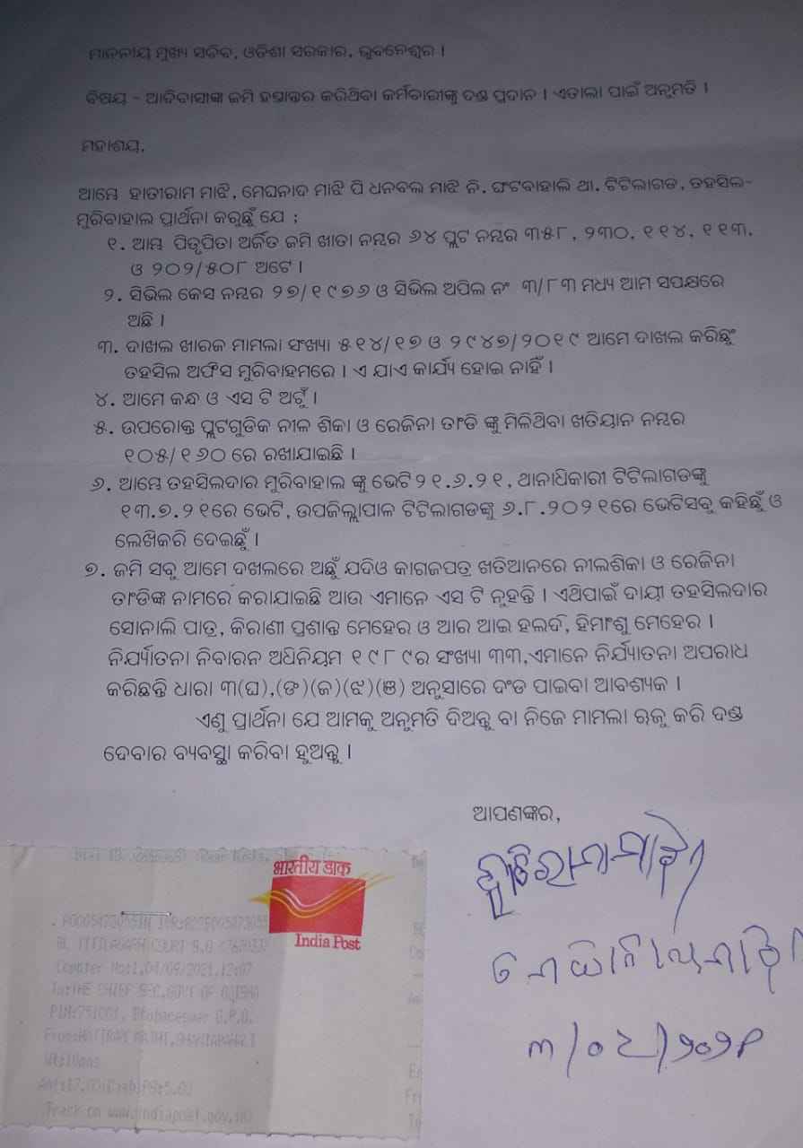ଟିଟିଲାଗଡ଼ (ପ୍ରେରଣା ଖବର ): ବଲାଙ୍ଗୀର ଜିଲ୍ଲା ମୁରିବାହଲ ତହସିଲରେ ଖୋଲାଖୋଲି ବିଭାଗୀୟ ଅଧିକାରୀ ଜଣେ ଆଦିବାସୀ ଯିଏକି ଜାତିରେ କନ୍ଧ ତାଙ୍କ ଅଜାଣତରେ ମାନ୍ୟବର ଭାରତୀୟ ଦଣ୍ଡ ବିଧାନ ନିୟମ ର ଖିଲାପ କରି ଭିନ୍ନ ଜାତିର ବ୍ୟକ୍ତିଙ୍କ ନାମରେ ନାମିତ କରିଦେଇଥିବା ପଶ୍ଚିମଓଡ଼ିଶା ଆଦିବାସୀ ସଂଘ ତରଫରୁ ଲିଖିତ ଅଭିଯୋଗ କରାଯାଇଛି । ସୂଚନା ଅନୁଯାୟୀ ବଲାଙ୍ଗୀର ଜିଲ୍ଲାର ମୁରିବାହାଲ ତହସିଲ ଅଧିନସ୍ଥ ଘଣ୍ଟବାହାଲି ଗ୍ରାମର ହାତୀରାମ ମାଝୀ ତାଙ୍କ ଜମି ଖାତା ନମ୍ବର ୬୪ ,ପ୍ଲଟ ନଂ-୩୫୮,୨୩୦,୧୧୪,୧୧୩,ଓ ୨୦୨,୫୦୮ ତାଙ୍କ ପିତୃ ଅର୍ଜିତ ନିଜସ୍ୱ ଜମି ହୋଇଥିବା ବେଳେ ଉକ୍ତ ଜମି କୁ ତାଙ୍କ ଅଜାଣତରେ ଉକ୍ତ ଗ୍ରାମର ନୀଳ ସିକା ଓ ରୋଜିନା ସିକା ନାମକ ଗୌଡ଼ ଜାତି ର ଉକ୍ତ ଦୁଇ ନାମରେ ନାମିତ କରିଦିଆଯାଇଛି । ସରକାରୀ ଭାବେ ଭିନ୍ନ ଜାତିର ଲୋକଙ୍କୁ ଆଇନର ଖିଲାପ କରି ଏପରି ଜମି ହସ୍ତାନ୍ତର କରିଦିଆଯିବା ନେଇ ହାତୀରାମ ମାଝୀ ଜାଣି ଦାଖଲ ଖାରଜ ନାମା ସଂଖ୍ୟା ୫୧୪/୧୭ ଅନୁଯାୟୀ ଡିଗ୍ରୀ ହାସଲ କରିଛନ୍ତି । ସରକାରୀ ଭାବେ ଏହି ଜମି ମୁରିବାହାଲ ତହସିଲଦାର ସୋନାଲି ପାତ୍ର,କିରାଣୀ ପ୍ରଶାନ୍ତ ମେହେର,ଆର ଆଇ ହିମାଂଶୁ ମେହେର ଚଞ୍ଚକତା କରି ଅର୍ଥ କାରବାର କରିଥିବା ଅଭିଯୋଗ ହୋଇଛି । ନିର୍ଯ୍ୟାତନା ନିବାରଣ ଅଧିନିୟମ ୧୯୮୯ ସଂଖ୍ୟା ୩୩ ଅନୁଯାୟୀ ଦଣ୍ଡବିଧାନ କରାଯିବା ପାଇଁ ସମସ୍ତ ଉଚ୍ଚ ପଦାଧିକାରୀ ଙ୍କ ନିକଟରେ ତଥା ଓଡ଼ିଶା ରାଜ୍ୟ ମୁଖ୍ୟ ଶାସନ ସଚିବଙ୍କ ନିକଟକୁ ଡାକ ଯୋଗେ ଲିଖିତ ଅଭିଯୋଗ ପତ୍ର ପ୍ରେରଣ କରାଯାଇଛି । ସେହିପରି ଏହି ଆଦିବାସୀ ଅଧ୍ୟୁଷିତ ଅଞ୍ଚଳ ତଥା ମୁରିବାହାଲ ତହସିଲ ଅଞ୍ଚଳରେ ଏପରି ସଂଖ୍ୟାଧିକ ମାମଲା ଲୋକଲୋଚନକୁ ଆସୁଥିବା ନେଇ ପଶ୍ଚିମ ଓଡିଶା ଆଦିବାସୀ ସଂଘ ପକ୍ଷରୁ ବିସିକେସନ ଜାନି ତଦନ୍ତ ସହ ଦୃଢ଼ କାର୍ଯ୍ୟାନୁଷ୍ଠାନ ଗ୍ରହଣ କରିବା ପାଇଁ ଦାବି କରିଛନ୍ତି ।