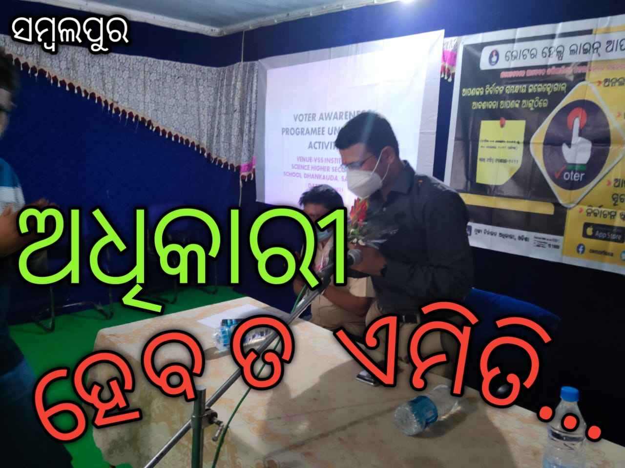ସମ୍ବଲପୁର,(ସଂଜୀବ କୁମାର ପାଣିଗ୍ରାହୀ) ଆଜି ସମ୍ବଲପୁର ସଦର ଉପଖଣ୍ଡର ଭିଏସଏସ କଲେଜ ଧନକଉଡା ଠାରେ ଉପଜିଲ୍ଲାପାଳ ତଥା ଇ. ଆର. ଓ ଶ୍ରୀ ମୟୁର ସୂର୍ଯ୍ୟବଂଶୀ(ଆଇ. ଏ. ଏସ ) ଏବଂ ସଦର ତହସିଲଦାର ଶ୍ରୀ ଲକ୍ଷ୍ମଣ ଅମାତ ଉପସ୍ଥିତ ରହି ଛାତ୍ରଛାତ୍ରୀଙ୍କୁ ଭୋଟର ସଚେତନ କରିଥିଲେ | ଡ. ଜସକେତନ ସାହୁ କଲେଜ